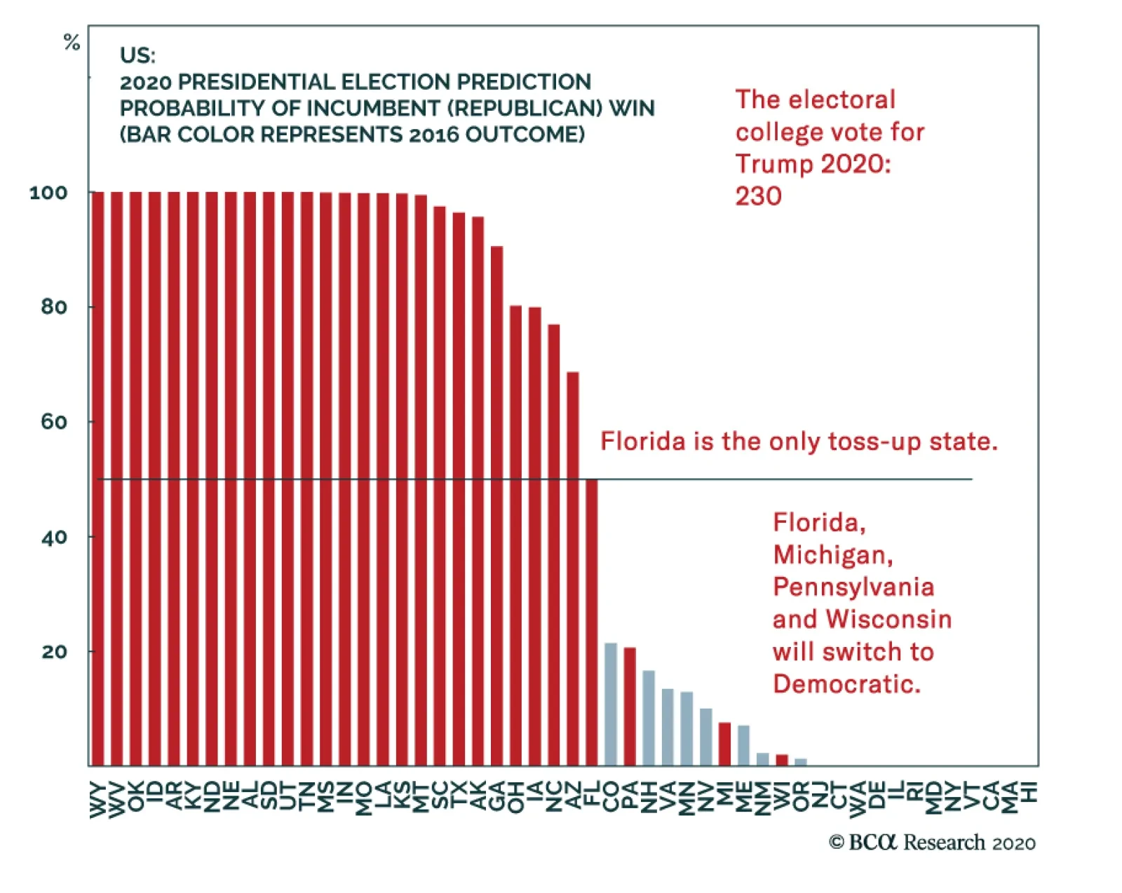 BCA Research’s Geopolitical Strategy service’s quantitative election model now shows Florida as a toss-up state with a 50% chance of flipping back into the Republican fold. As long as the economy continues…