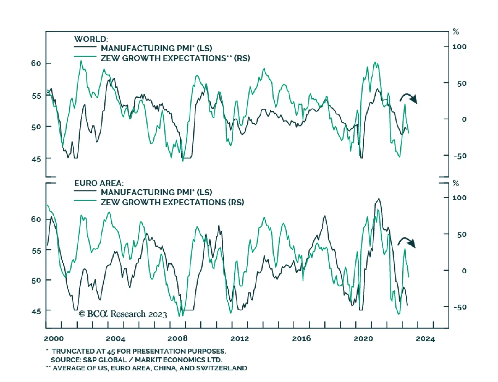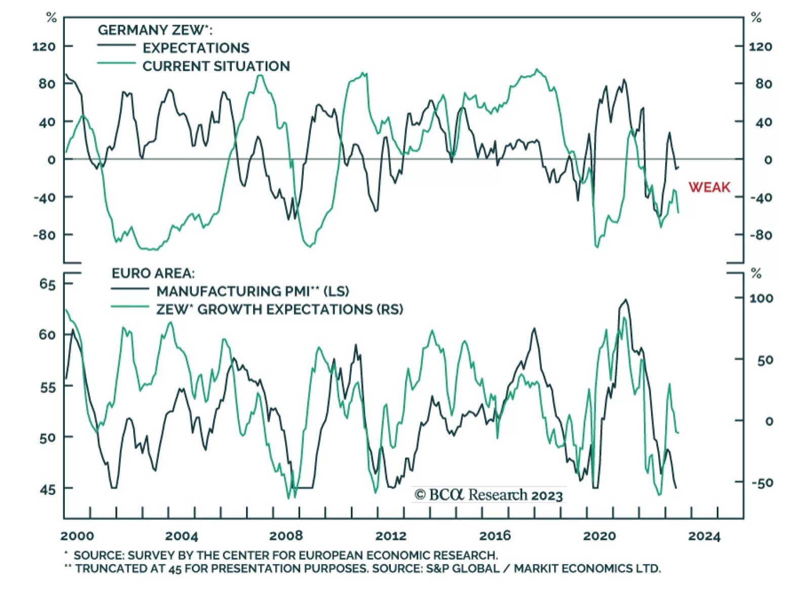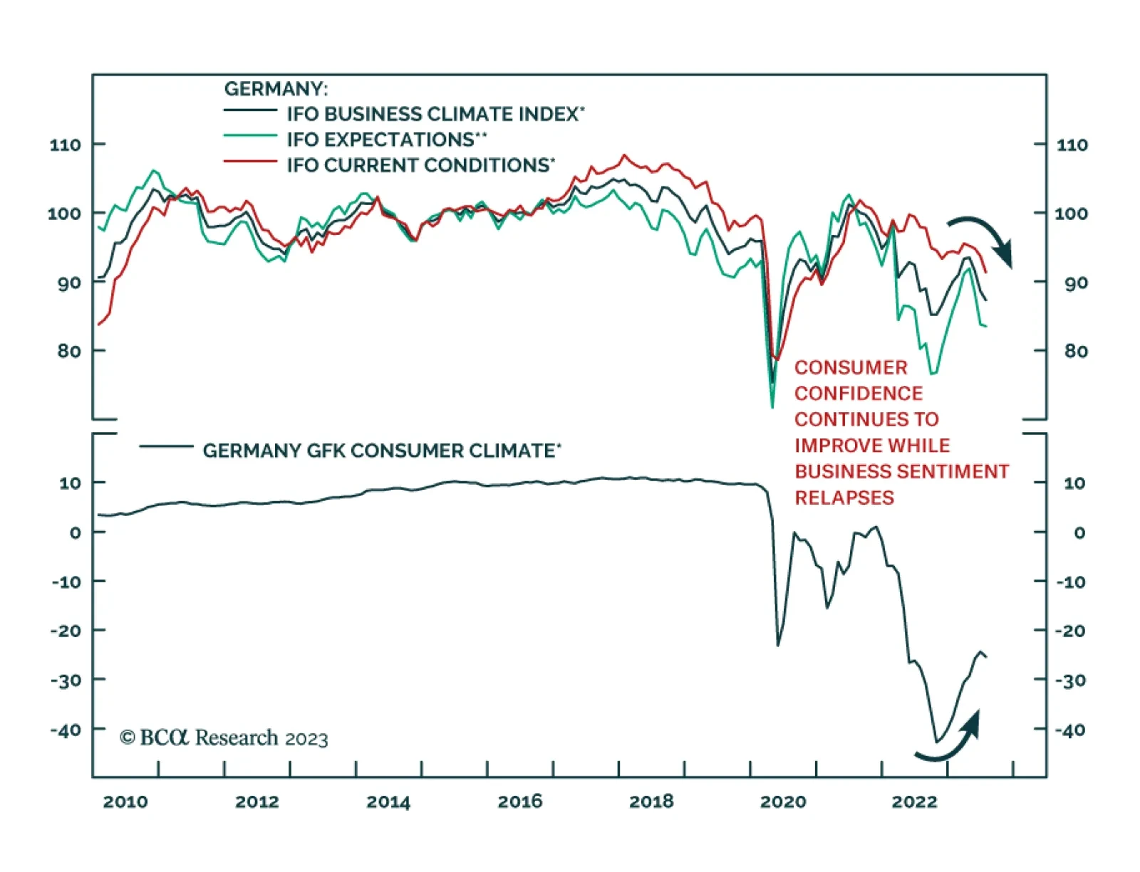 The lift to European investor sentiment from the ebbing energy crisis is now in the rear-view mirror. The German ZEW Indicator of Economic Sentiment fell back below 0 in May to -10.7 from 4.1. The negative reading indicates that…