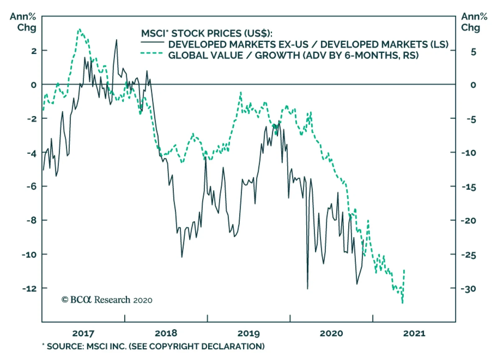From the perspective of a US-based investor, the chart above highlights that the relative performance of international developed market (DM) equities has been strongly correlated, with a lag, to the trend in value versus growth over the past few years. This…