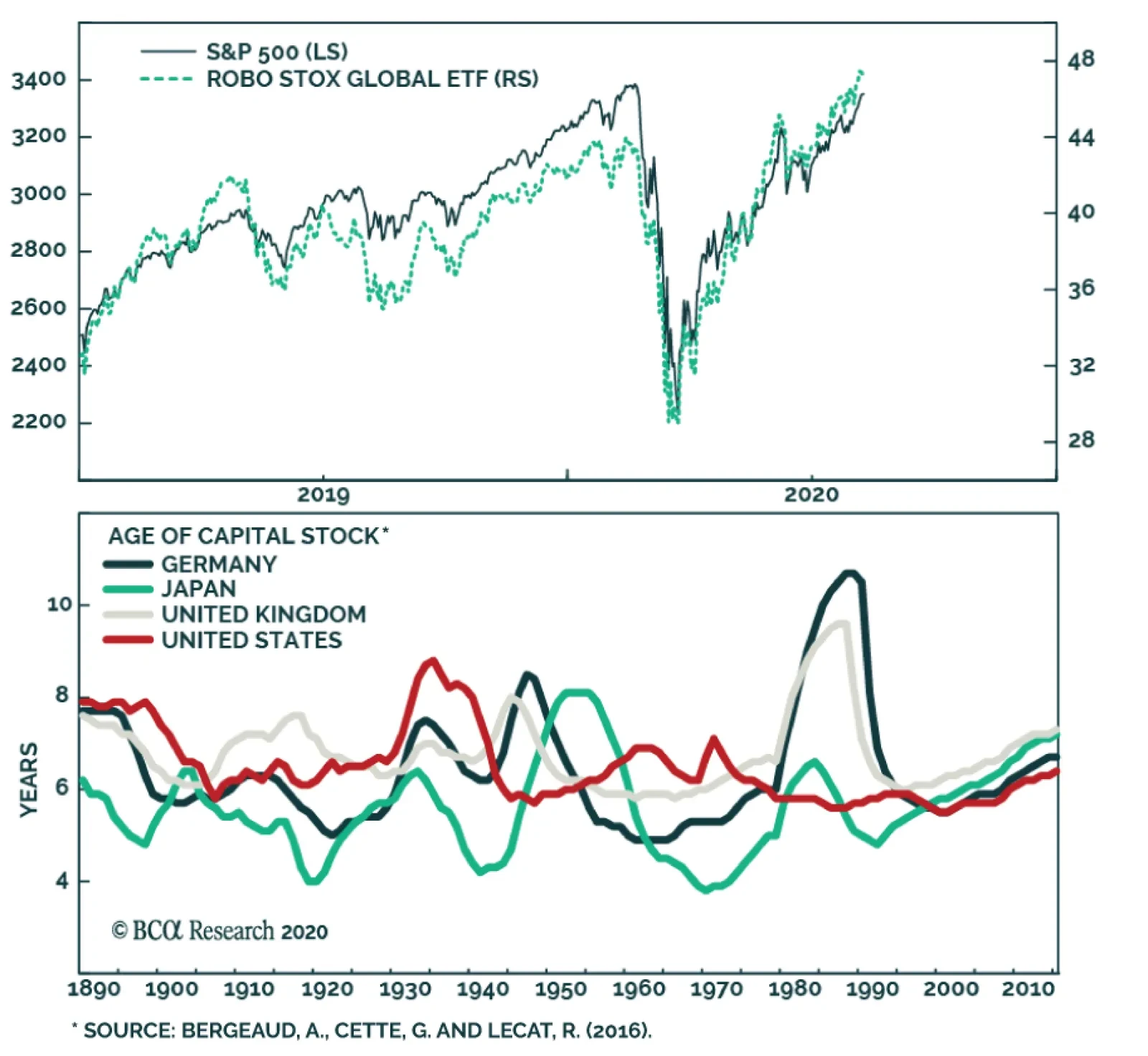 The second set of risks would be regulatory: A move to break up companies such as Google and Amazon, the US introducing data privacy legislation similar to that in the European Union, or a move to a digital tax or minimum global taxation. None of these seems likely in the immediate future. Automation/Robotics/Capital Goods The return, at the margin, of some manufacturing to the United States (and other developed economies) will bring about economic changes. Unable to tap into the pool of cheap international labor as easily as before, companies will have to invest significantly in this sector. This will result in the following: A resurgence of manufacturing productivity, thanks to increased investment. An intensification of automation. The US will need to boost the number of robots per capita to compete with Korea, Germany, and Japan. This will further improve productivity. The development of a high-tech manufacturing sector. Analogous to the FAANG stocks during the 2010s, a new group of innovative manufacturing companies could emerge. New infrastructure, roads, factories, and machinery will be needed to replace what is now an outdated capital stock in the US (Chart 30). These trends should all be positive for the capital-goods sector. Such a project would also need large amounts of raw materials. This might push up the prices of commodities such as industrial metals, and benefit materials producers. As mentioned above, it could boost the price of real estate outside of the major cities, where the new manufacturers would be likely to set up. Chart 30The US Capital Stock Is Becoming Outdated