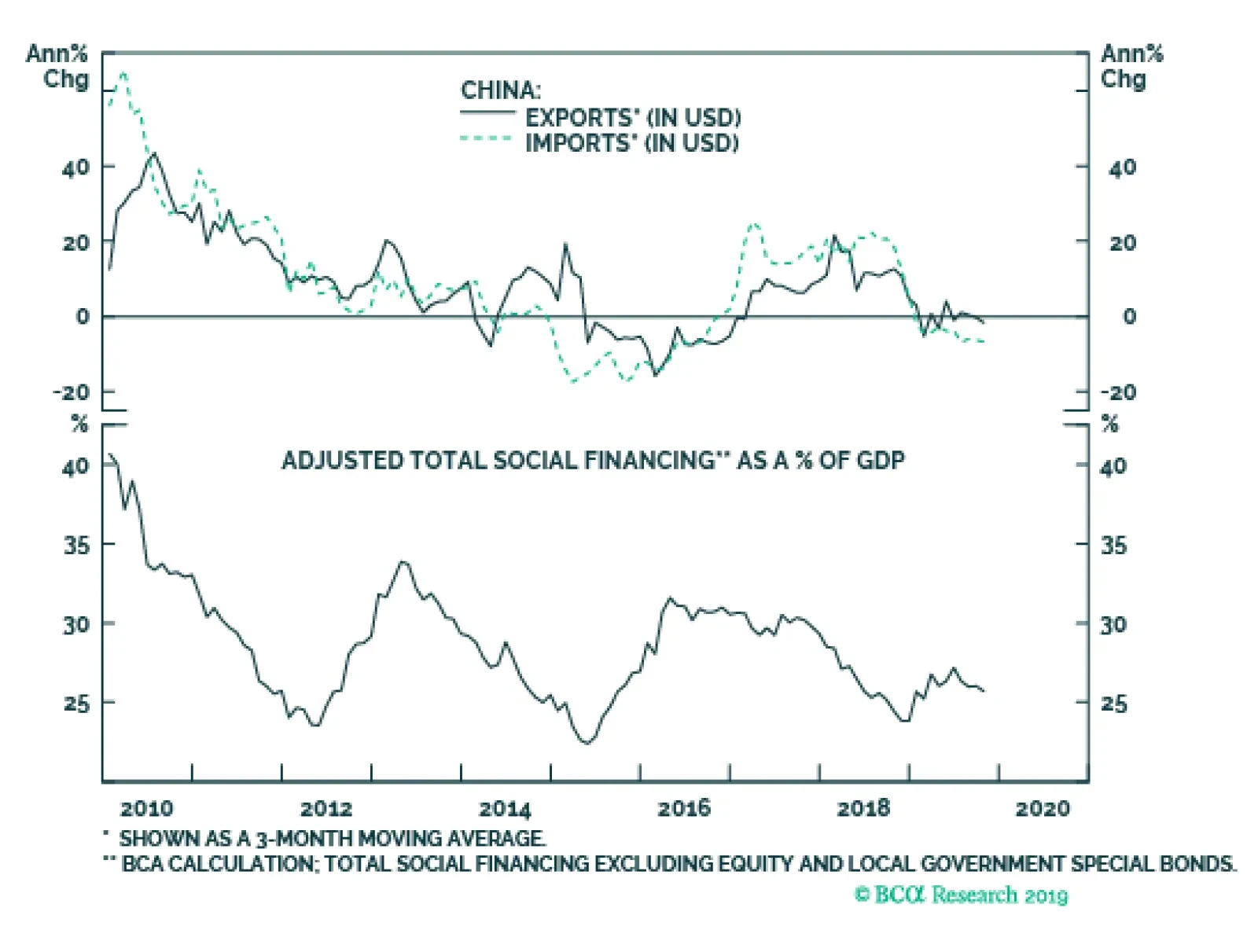 If a détente in the trade war is reached, will this prompt China to go back to its deleveraging campaign? We do not think so. For one thing, there can be no assurance that a trade truce will last. Thus, China will want to maintain enough stimulus as an insurance policy. In addition, credit growth is currently running only a few percentage points above nominal GDP growth (Chart 8). With the ratio of credit-to-GDP barely rising, there is little need to bring credit growth down much from current levels. This does not mean that the Chinese authorities will allow credit growth to increase significantly further. Instead, the authorities will continue shifting the composition of credit growth from the riskier shadow banking sector to the safer formal banking sector, while increasingly leaning on fiscal policy to buttress growth. One of the developments that has gone largely unnoticed by investors this year is that China’s general government deficit has climbed from around 3% of GDP in mid-2018 to 6.5% of GDP at present (Chart 9). Some of this stimulus has been used to finance tax cuts for households. Some of it has also been used to finance infrastructure spending, which requires imports of raw materials and capital goods. As a result of this fiscal easing, the combined Chinese credit/fiscal impulse has risen to a two-year high. It leads global growth by about nine months (Chart 10). Chart 9China Has Been Stimulating, Fiscally