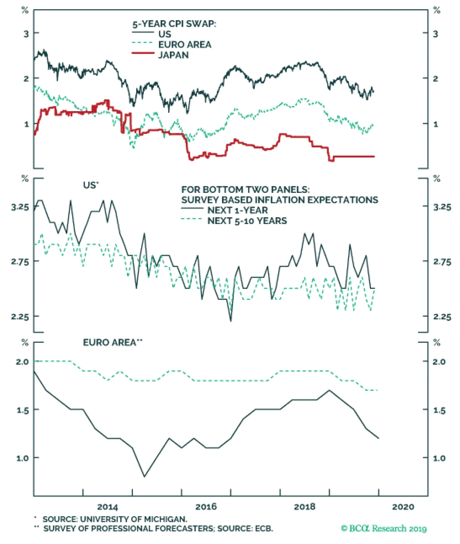 In late November, BCA Research published its 2020 Outlook titled Heading Into The End Game, an annual discussion between BCA’s managing editors and the firm’s longstanding clients Mr. and Ms X.1 We recommend GAA clients read that document for a full analysis of the macro and investment environment we expect in 2020. In this Monthly Portfolio Outlook, we focus on portfolio construction: how we would recommend positioning a global multi-asset portfolio for the 12-month investment horizon in light of that analysis. First, a brief summary of the BCA macro outlook. We believe the global manufacturing cycle is starting to bottom out, partly because of its usual periodicity of 18 months from peak to trough, and also because of easier financial conditions, and some moderate fiscal and credit stimulus from China (Chart 1). Central banks will remain dovish next year despite accelerating growth. The Fed, in particular, worries that inflation expectations have become unanchored (Chart 2) and, moreover, will be reluctant to raise rates ahead of the US presidential election. This environment implies a moderate rise in long-term interest rates, with the US 10-year Treasury yield rising to 2.2-2.5%. Chart 1Reasons To Expect A Rebound