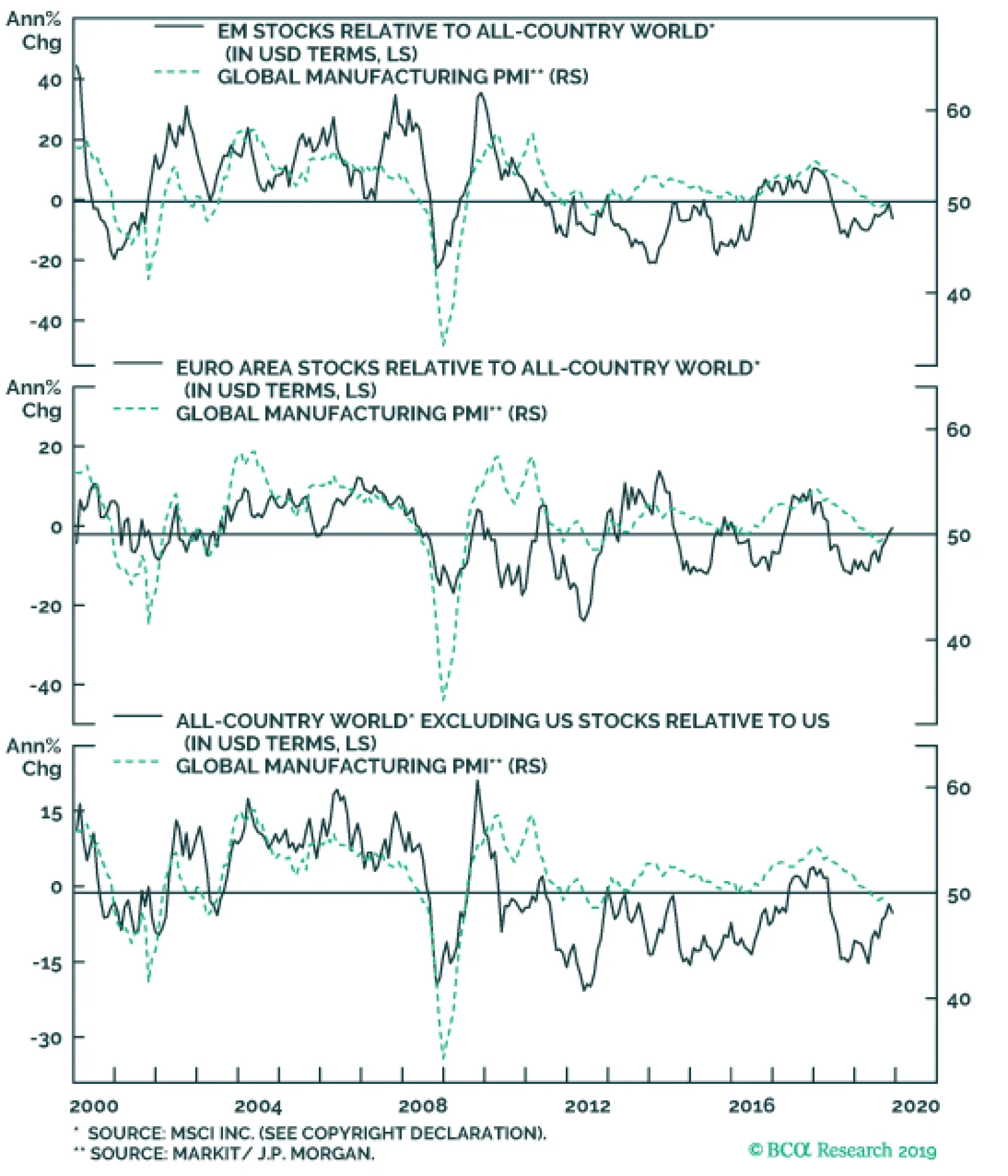 Highlights Investors should remain overweight global stocks relative to bonds over the next 12 months and begin shifting equity exposure towards non-US markets. Bond yields will rise next year as global growth picks up, while the dollar will sell off. The extent to which bond yields increase over the long term depends on whether inflation eventually stages a comeback. Today’s high debt levels could turn out to be deflationary if they curtail spending by overstretched households, firms, and governments. However, high debt levels could also prompt central banks to engineer higher inflation in order to reduce the real burden of debt obligations. Which of these two effects will win out depends on whether central banks are able to gain traction over the economy. This ultimately boils down to whether the neutral rate of interest is positive or negative in nominal terms. While there is little that policymakers can do to alter certain drivers of the neutral rate such as the trend rate of economic growth, they do have control over other drivers such as the stance of fiscal policy. Ironically, a structural shift towards easier fiscal policy could lead to a decline in government debt-to-GDP ratios if higher inflation, together with central bankers' reluctance to raise nominal rates, pushes real rates down far enough. This suggests that the endgame for today’s high debt levels is likely to be overheated economies and rising inflation. Stay Bullish On Stocks But Shift Towards Non-US Equities We returned to a cyclically bullish stance on global equities following the stock market selloff late last year, having temporarily moved to the sidelines in June 2018. We have remained overweight global equities throughout 2019. Two weeks ago, we increased our pro-cyclical bias by upgrading non-US stocks within our recommended equity allocation at the expense of their US peers. Our decision to upgrade non-US equities stems from the conviction that global growth has turned the corner. Manufacturing has been at the heart of the global slowdown. As we have often pointed out, manufacturing cycles tend to last about three years – 18 months of weaker growth followed by 18 months of stronger growth (Chart 1). The current slowdown began in the first half of 2018, and right on cue, the recent data has begun to improve. The global manufacturing PMI has moved off its lows, with significant gains seen in the new orders-to-inventories component. Global growth expectations in the ZEW survey have rebounded. US durable goods orders surprised on the upside in October. The regional Fed manufacturing surveys have also brightened, suggesting upside for the ISM next week (Chart 2). Chart 1A Fairly Regular Three-Year Manufacturing Cycle