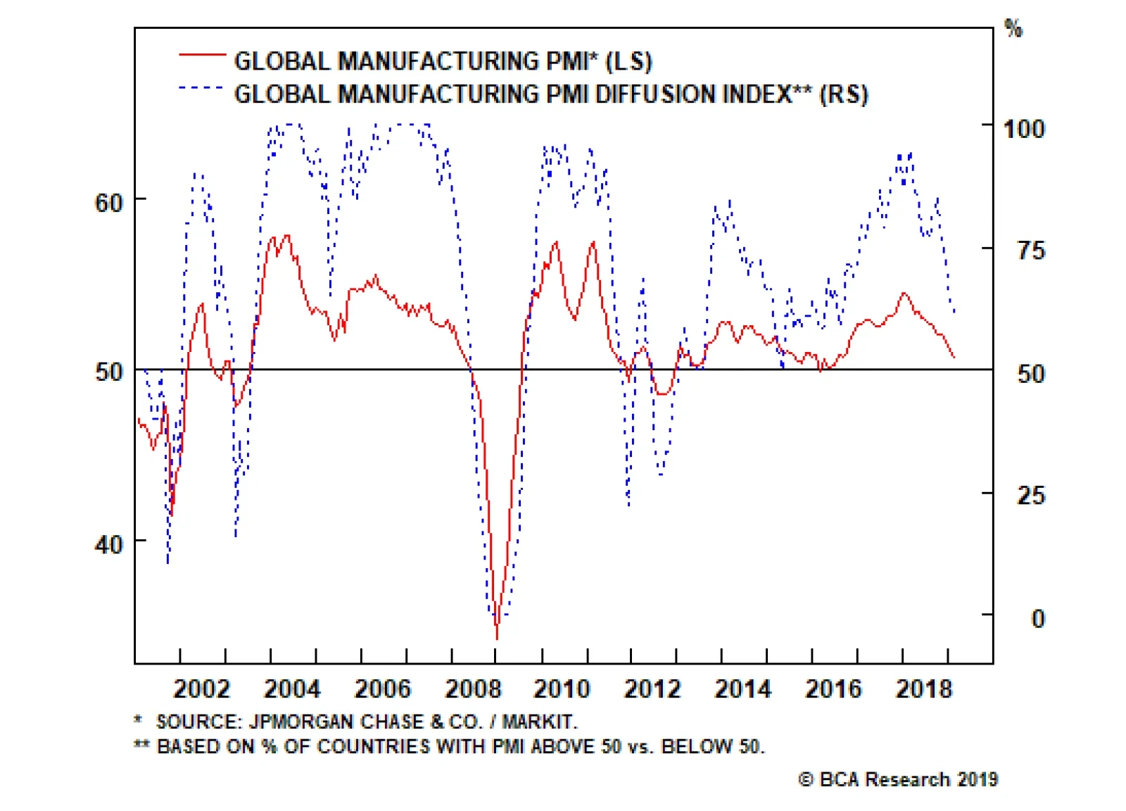 Highlights U.S. growth remains robust, despite some temporary softness in recent months. Ex U.S., growth continues to fall but, with China probably now ramping up monetary stimulus, should bottom in the second half. Central banks everywhere have turned more dovish, partly in an attempt to push up inflation expectations. The combination of resilient growth and easier monetary policy should be good for global equities. We remain overweight equities versus bonds. Bond yields have fallen sharply everywhere. However, with U.S. inflation still trending up, and central banks unlikely to turn any more dovish this year, yields are unlikely to fall much further in 2019. We recommend a slight underweight on duration. We remain overweight U.S. equities, but are on watch to upgrade the euro zone and Emerging Markets when we have stronger conviction about China’s stimulus. Given structural headwinds in both Europe and EM, this would probably be only a tactical upgrade. We have been tilting our equity sector recommendations in a more cyclical direction, last month raising Industrials and Energy to overweight. We also prefer credit over government bonds within the fixed-income category, though we warn that spreads will not fall much further given weak corporate fundamentals. Feature Recommended Allocation