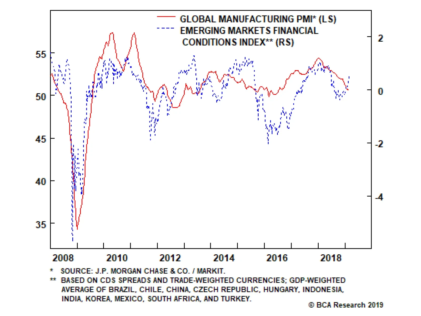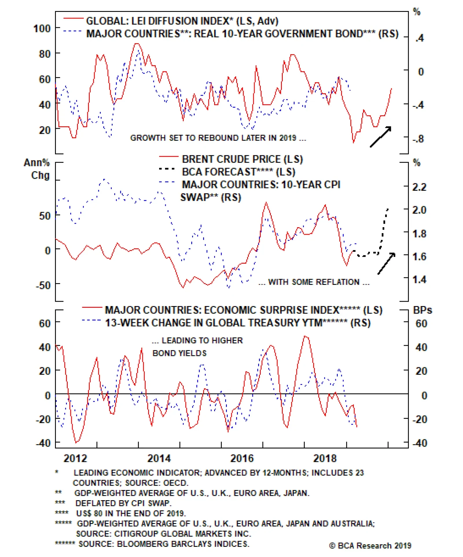 The greater influence of the real component of yields makes sense, as markets now discount fewer rate hikes and more accommodative monetary policy. Currently, our recommended country allocation in the Governments portion of our model bond portfolio includes underweights in the U.S., Canada and Italy and overweights in Australia, the U.K., Japan, Germany, France and Spain (the latter is a position versus Italy within an overall underweight stance on Peripheral European debt). In light of the more ubiquitously neutral/dovish global policy bias, we are reevaluating those country tilts per the following indicators: 1. Cyclical growth indicators: Both manufacturing purchasing managers indices (PMIs) and the leading economic indicators (LEIs) produced by the OECD are well off the cyclical peaks (Chart 3). In terms of levels, the PMIs are holding above the 50 threshold, suggesting expanding manufacturing activity, in the U.S., U.K., Canada and Australia, but are below 50 in the euro area and Japan. Chart 3Growth Has Lost Momentum Everywhere
