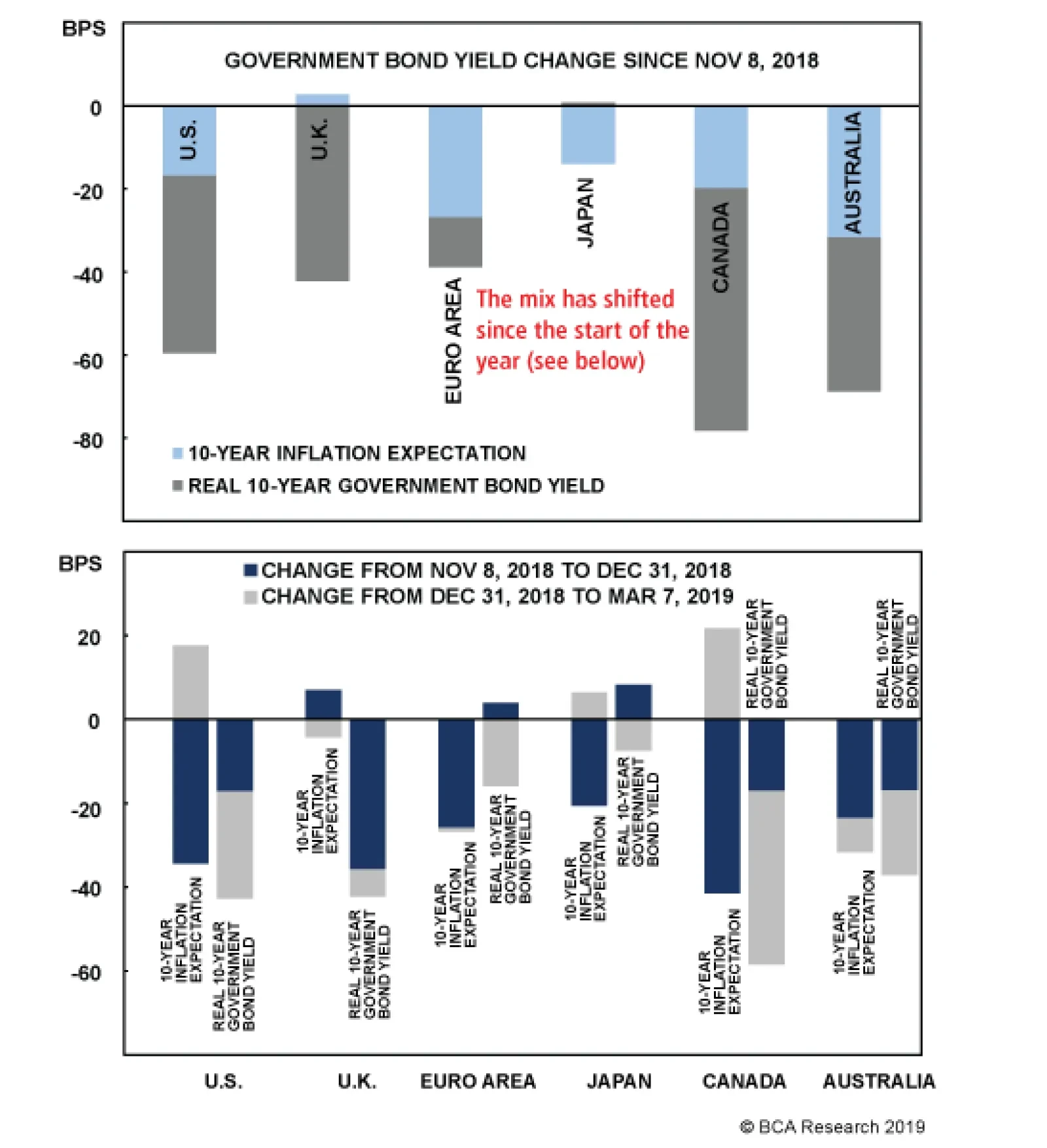 While maintaining a below-benchmark duration stance, the synchronized shift in central bank forward guidance justifies a review of the recommended country allocations in our model fixed income portfolio. Taking Stock Of Our Country Tilts In Our Model Bond Portfolio Global government bond yields peaked back in early November and have fallen in all of the major developed economies (Chart 2). Decomposing the move in benchmark 10-year yields into inflation expectations (using CPI swap rates) and real yields (the difference between nominal yields and CPI swap rates) shows that the bulk of that decline has come from lower real rates in the countries with positive policy rates (U.S., Canada, U.K. and Australia). For countries with zero or negative policy rates (core Europe, Japan), most of the yield decline has been due to falling inflation expectations. Yet the drivers of the decline in yields have changed from the latter two months of 2018 to the first few months of 2019. Generally speaking, the late-2018 bond market rally reflected falling inflation expectations, while recent changes have been a function of moves in real yields. Only in Australia have real yields and inflation expectations both declined steadily since the early November peak in global bond yields.