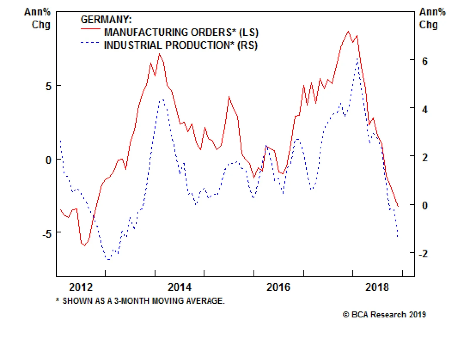 Europe and Japan, in particular, are feeling the pinch. German GDP only grew 1.5% in 2018, implying that Q4 GDP growth was in the vicinity of just 0.2% QoQ. Meanwhile, European industrial production contracted by 3.3% year-over-year in December. The German Ifo and ZEW surveys do not point to any significant improvements in this trend. A few idiosyncratic factors explain some of this poor performance, including new emissions testing standards that have weighted on the German auto industry, a tightening in financial conditions in Italy, and the ‘gilets jaunes’ protests in France. Nonetheless, the euro area slowdown cannot be fully explained by one-off factors. The economy is highly sensitive to global trade fluctuations given that 18% of the euro area’s gross value added is generated in the manufacturing sector. Hence, China’s poor economic health has been painful for Europe, and the trend in Chinese credit does not bode well for the near term (Chart I-10). The European Central Bank (ECB) is likely to stay on the defensive as a result, especially as euro area core inflation, which has been stuck near 1% for three years, is unlikely to pick up if growth remains on the back foot. The ECB stuck with the view that the economic soft patch is temporary after the January policy meeting, but policymakers will consider providing more stimulus in March if the economy does not pick up (using forward guidance or a new TLTRO). This will weigh on the euro. Chart I-10China's Woes Are Infecting Europe