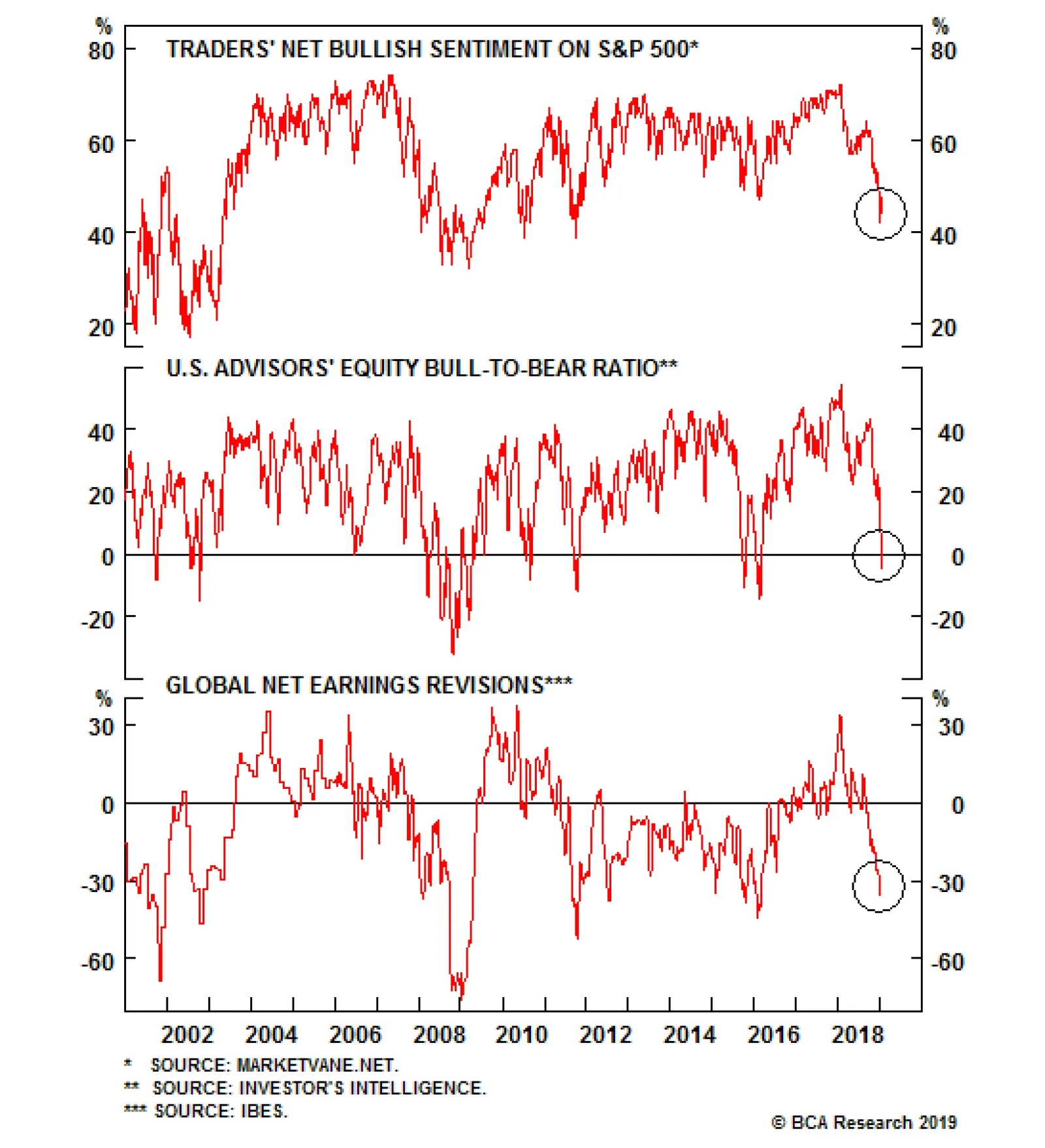 Bottom Line: The next big move in the U.S. dollar will likely be up, not down. Investment Considerations Global equity prices are already reflecting a lot of bad news; they are oversold, and investor sentiment on global growth has become downbeat (Chart I-13). This could create a window for global equities to rebound on a tactical basis. Chart I-13U.S./Global Stocks Are Oversold