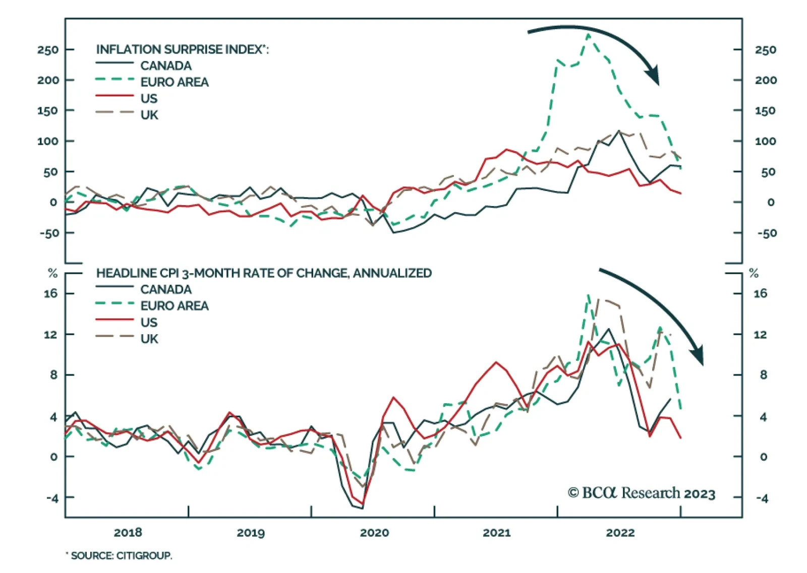 Inflation Surprise Indices have come down from stratospheric levels across DM economies, indicating that inflation figures are surprising by smaller margins. The moderation is broad-based across the US, Euro Area, UK, and Canada…
