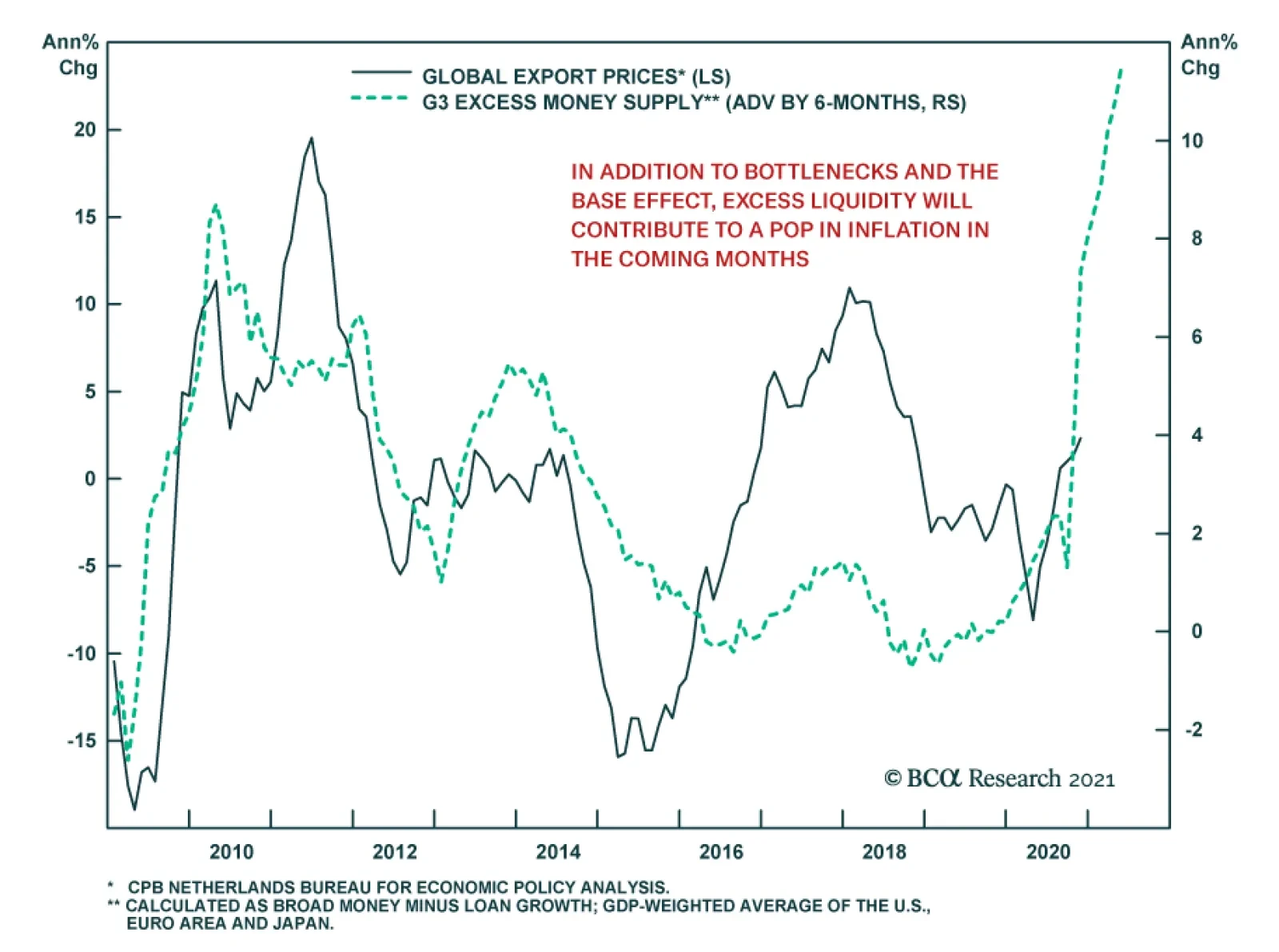After many false alarms, could the inflationistas get the last laugh in 2021? The idea is not entirely far-fetched. Consider the case of the US. Chart 5 shows that US households are sitting on $1.5 trillion of excess savings – equivalent to 10% of annual consumption. The amount of dry powder US households have at their disposal will only get larger. Taken together, the stimulus deal Congress reached in December and President Biden’s proposed fiscal package would inject an average of $300 billion per month into the economy through the end of September. Republicans and centrist Democrats in the Senate may force Biden to winnow down his stimulus plans to something closer to $1 trillion. Nevertheless, this still would provide about $200 billion in incremental monthly support. Official estimates made by the Congressional Budget Office last summer imply that the monthly output gap – the difference between what the economy is capable of producing and what it actually is producing – is currently only $80 billion. In fact, the true output gap may be even lower than this. First, GDP has recovered more rapidly than the CBO had projected. Second, official estimates of the output gap do not control for the fact that part of the economy’s productive capacity – certain retail establishments, hotels, airlines, etc. – has been rendered either fully or partly inoperative due to the pandemic. Third, official estimates also do not account for the fact that generous jobless benefits may have made some workers less eager to find work, thus temporarily raising the natural rate of unemployment. Inflation: Movin’ On Up If the demand for goods and services exceeds supply, prices are likely to go up. How much will they rise? In the near term, inflation is certain to increase from very low levels, if only due to base effects. As my colleague Ryan Swift has noted, both core PCE and core CPI inflation will soon spike above 2% on an annualized basis even if consumer prices rise by a meager 0.15% per month, as the deflationary March and April 2020 data points fall out of the rolling 12-month average (Chart 6). Looking beyond the next few months, the trajectory for inflation will depend on the degree to which the economy overheats. In some categories, there is already evidence of excess demand. US core goods inflation is running at 1.6%, the highest level since 2012. The ISM manufacturing Prices Paid index points to further upside for goods inflation. Soaring commodity prices tell a similar tale (Chart 7). Chart 6Base Effects Will Push Inflation Higher