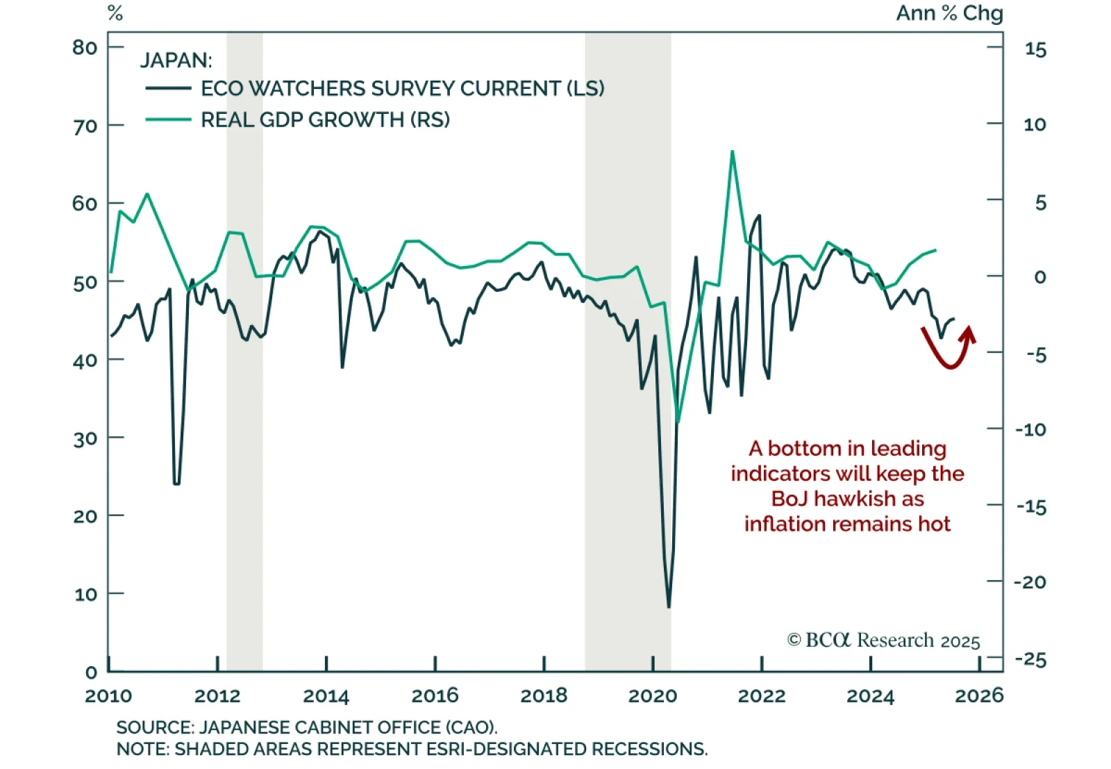 Japan’s Eco Watchers survey suggests growth has troughed, making JGBs vulnerable in both global slowdown and reacceleration scenarios. The July survey showed current conditions ticking up to 45.2 and expectations improving to 47…