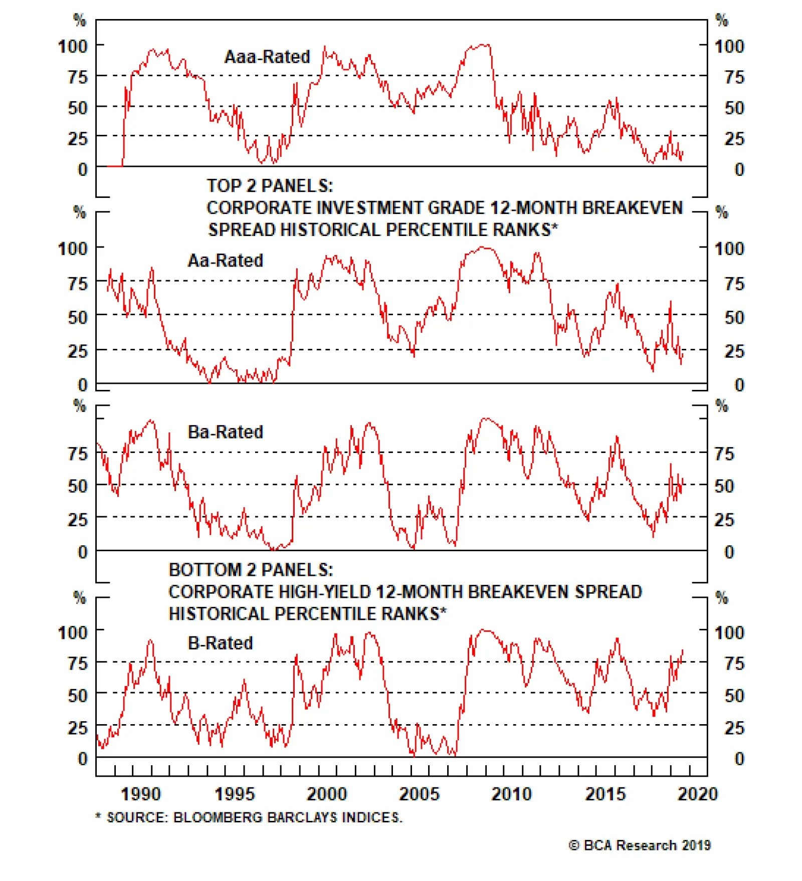 The chart above shows the 12-month breakeven spread for each credit tier as a percentile rank relative to history. We show each credit tier individually to control for the time-varying average credit rating of the overall indexes…