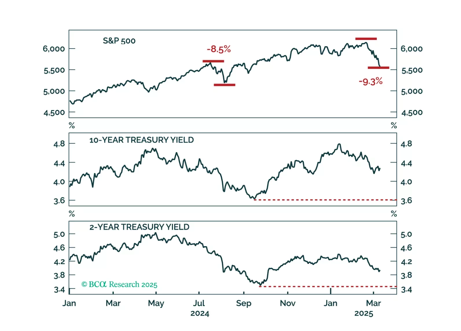 A falling stock market and sticky bond yields represent the worst of both worlds for investors. We interrogate why bond yields haven’t dropped more given the large selloff seen in equities.