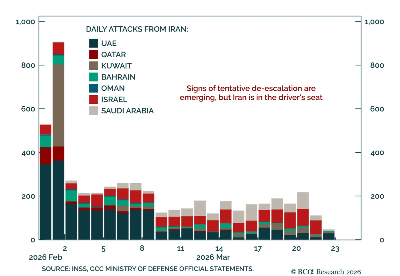 President Trump offered to deescalate the conflict in the Middle East on March 23. In a series of wide-ranging comments, President Trump said that regime change had already been achieved, that negotiations with Tehran were progressing, and that he was pausing his threat to target Iranian energy infrastructure for five days.