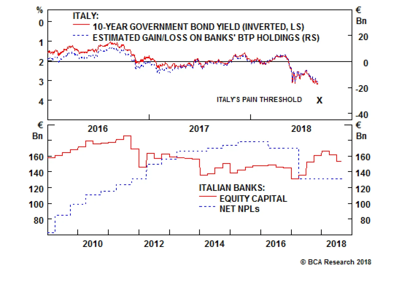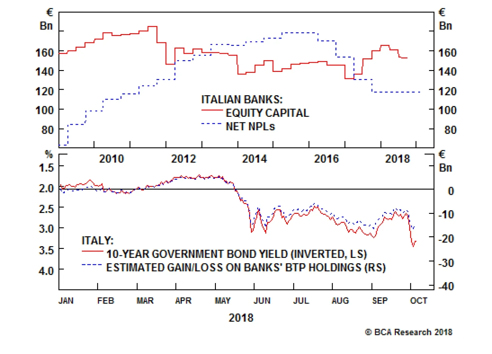 When Italian bond prices decline, it erodes the value of the €350 billion of BTPs held by Italian banks and also weakness their balance sheets. Investors start to get nervous about a bank's solvency when…