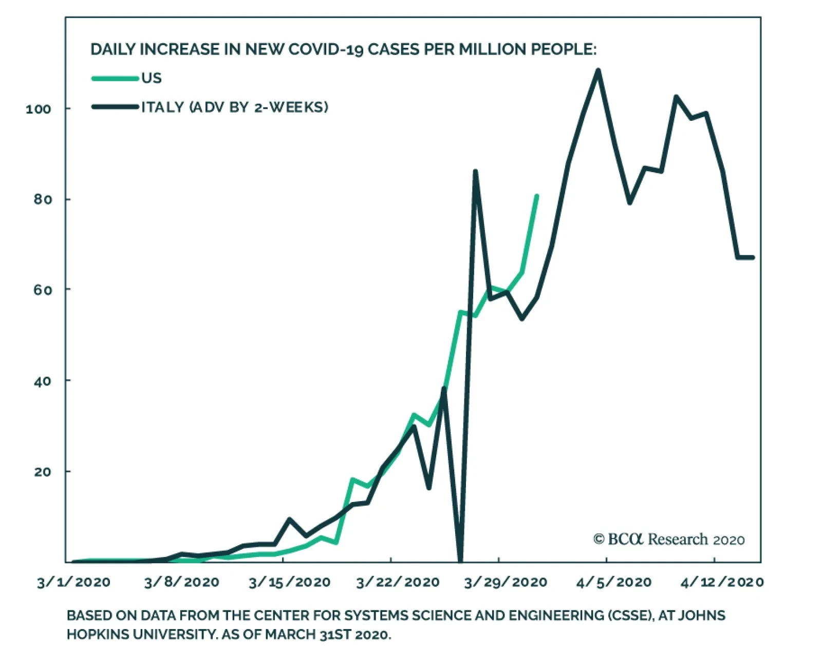 We noted in an Insight earlier this week that the US appears to be following Italy’s COVID-19 experience by roughly two weeks. The chart above makes this point more directly by comparing the US and Italian COVID-…