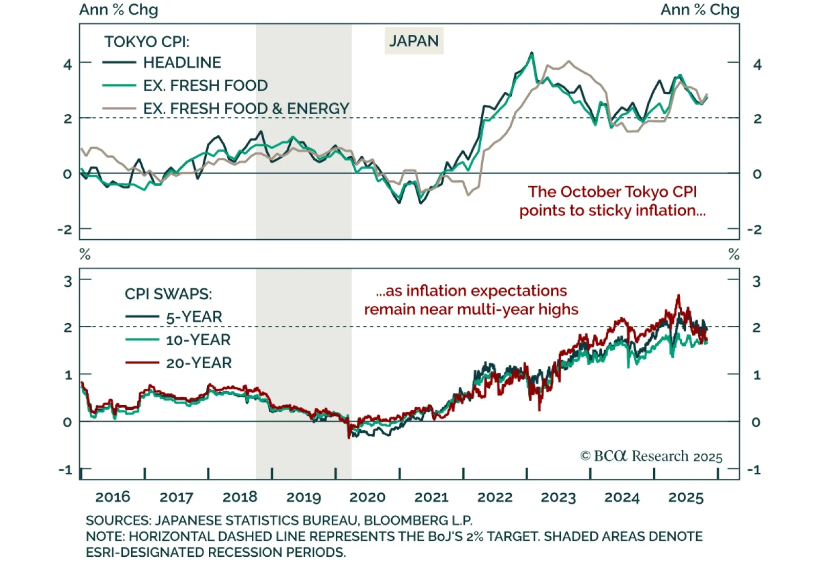 The October Tokyo CPI surprised to the upside, keeping pressure on the BoJ to resume rate hikes despite political pressures. Headline inflation rose to 2.8% from 2.5%, with both CPI ex-fresh food and “core core” (ex-fresh food and…