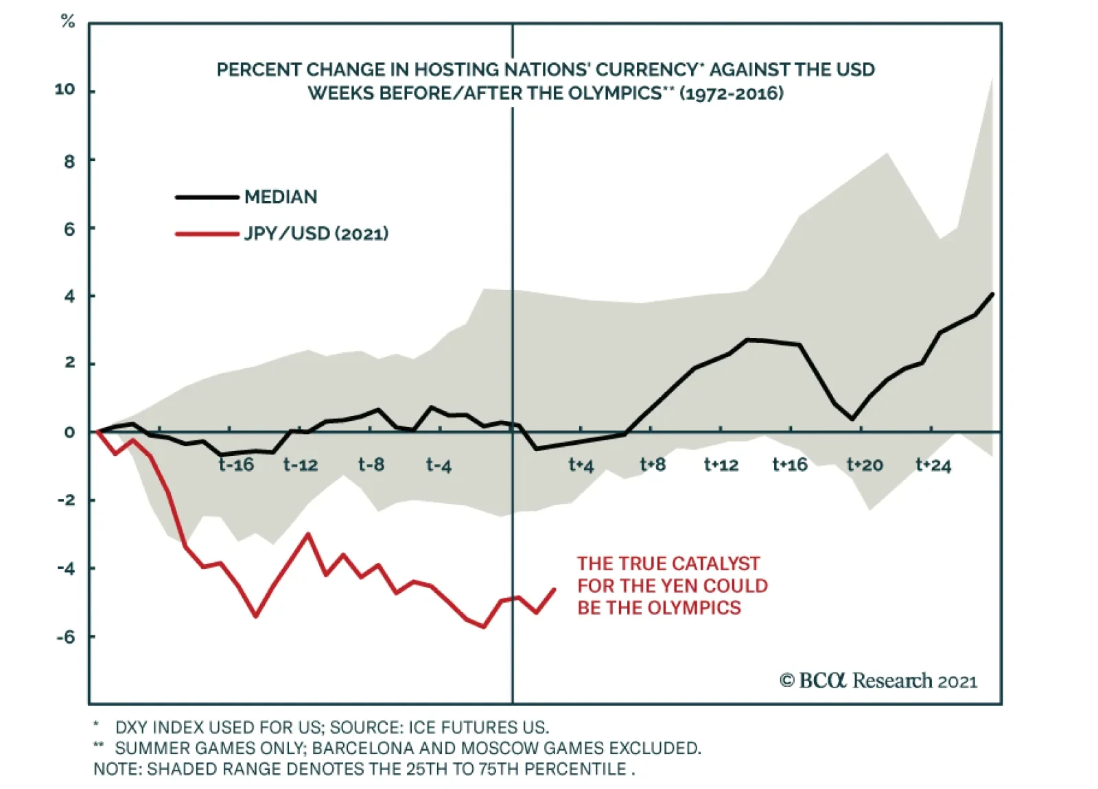 Since the 1970s, the median performance of a currency hosting the Olympics is 4% over a year. This year’s games have obviously been unique given the pandemic. However, the performance of the yen today already falls well…