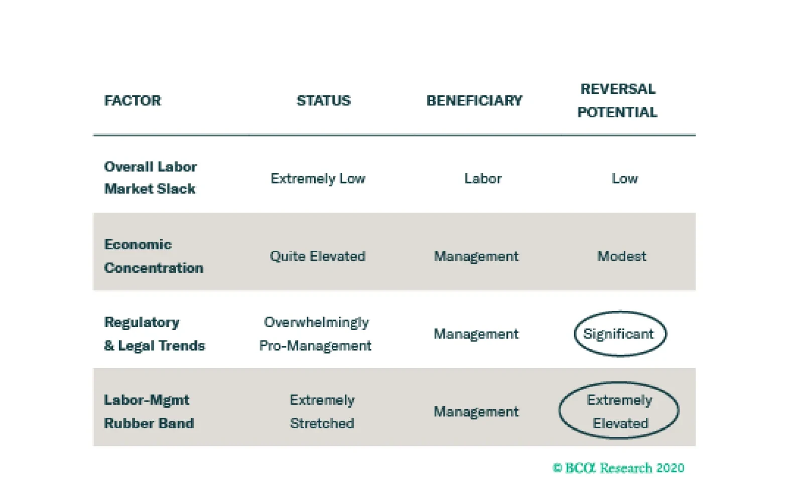 It is easy to see from Figure 2 why management has had the upper hand. Economic concentration and the legal and regulatory climate have increasingly favored it for decades. The immediate future seems poised to favor labor, however, as the legal and regulatory climate cannot get materially better for employers, and the labor-management rubber band has become so stretched that some sort of mean reversion is inevitable. We have high conviction that labor’s one current advantage, a tight labor market, will remain in its column over the next year or two. On a forward-looking basis, the macro factors as a whole are poised to support labor. Figure 2Macro Drivers Of Negotiating Leverage