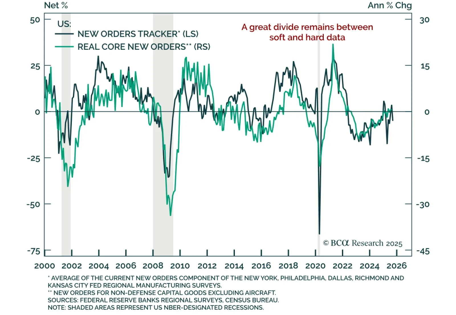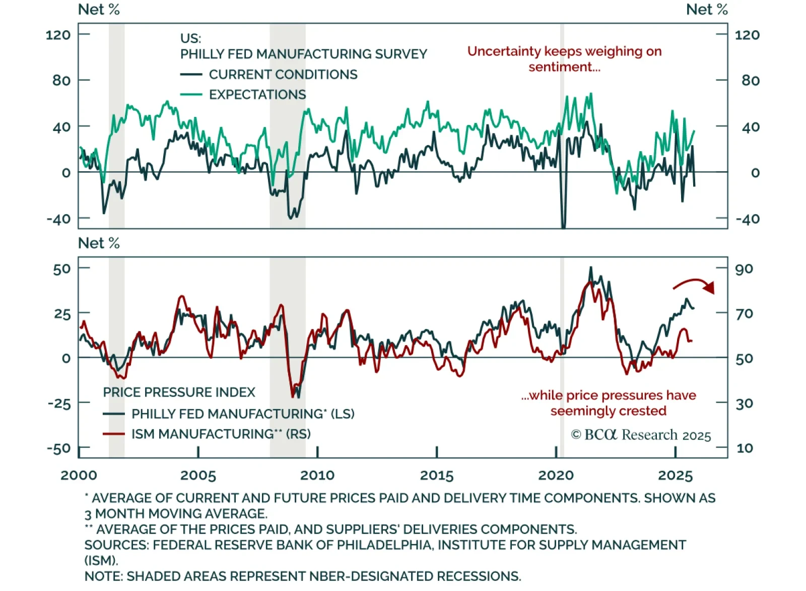 The October Philadelphia Fed manufacturing survey was mixed, showing weak headline data but steadier underlying components. The headline index fell to -12.8 from 23.2, the lowest level since April 2025. Underlying details were not as…