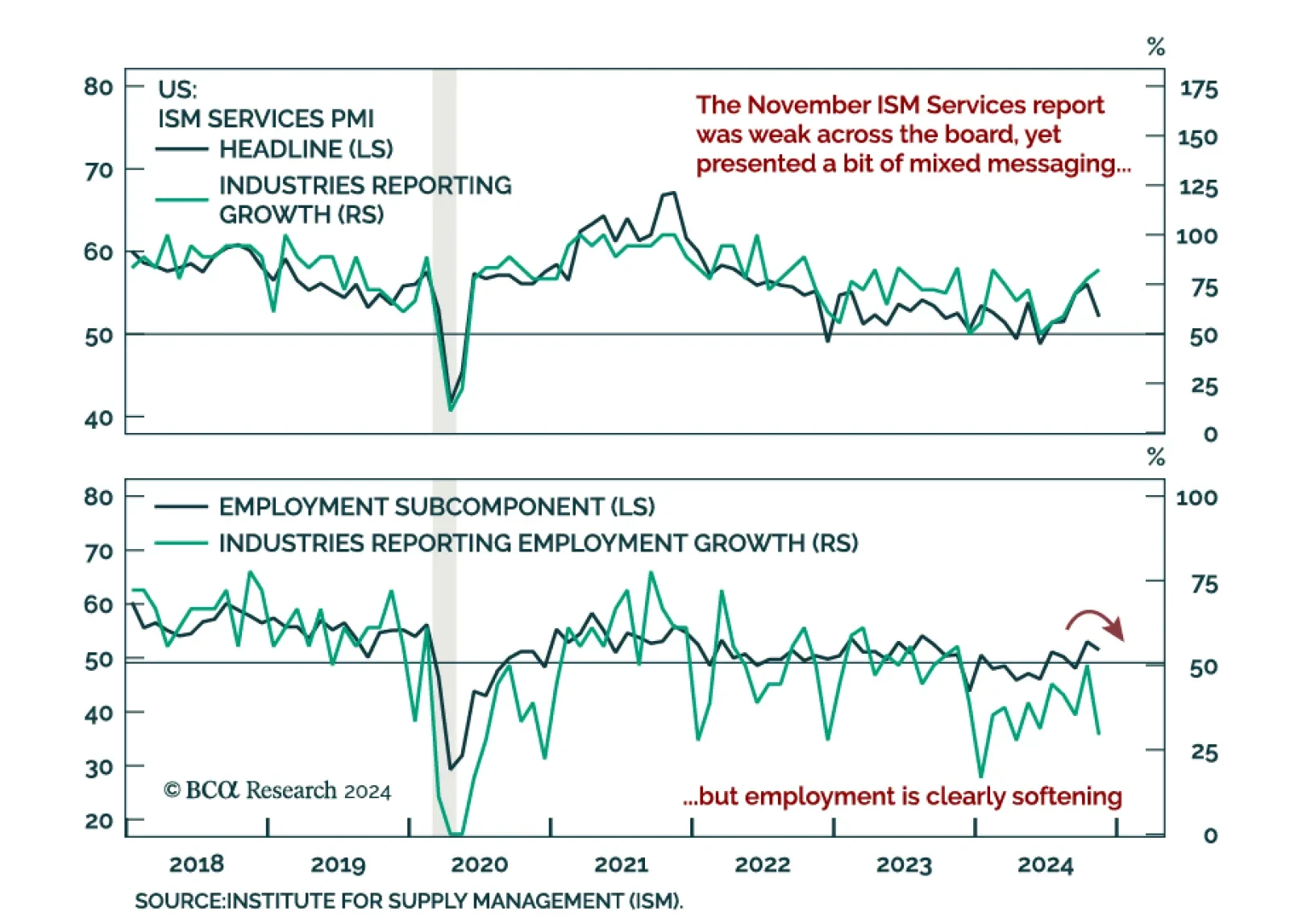 The November ISM Services PMI missed expectations, declining to 52.1 from 56 in October. All subcomponents declined, with new orders falling from 57.4 to 53.7. Employment also weakened but remains in expansion, while price…
