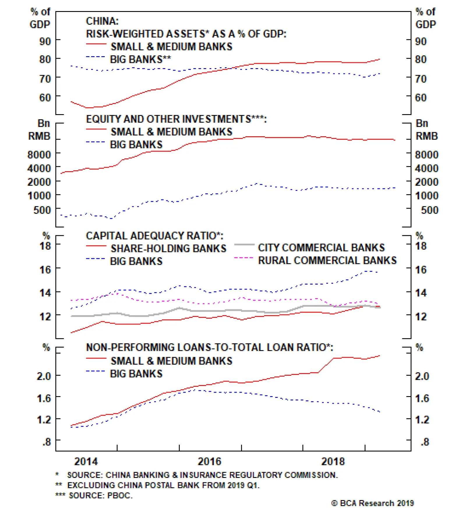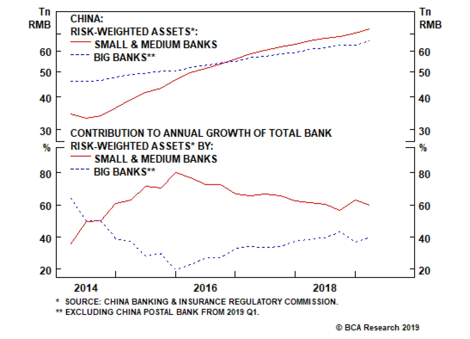 There has so far been no deleveraging among SMBs. Large banks’ RWAs-to-nominal GDP ratio has been in decline since 2014, but the same ratio for SMBs has not dropped at all. The first panel of the chart above corroborates that the credit boom between 2015…