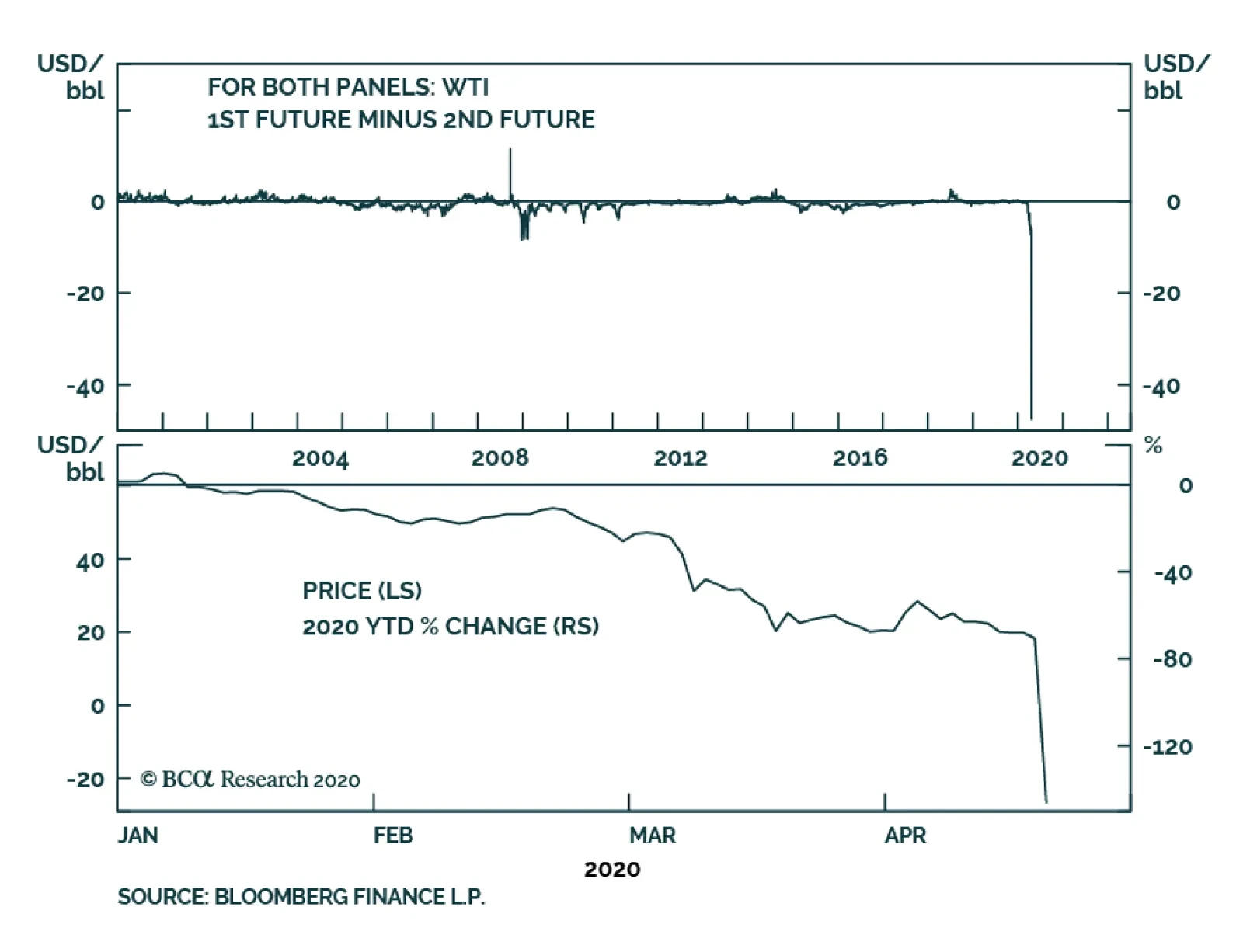 WTI crude oil delivered to Cushing in May 2020 is trading below $0.00/bbl as this note is typed, and falling fast (Chart 1). This is an historical print. WTI for June delivery is trading at ~ $22.00/bbl. What we are observing is the…