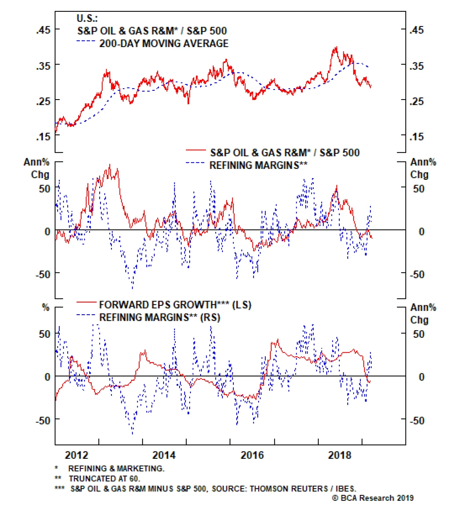 Underweight The S&P oil & gas refining & marketing index has typically performed in line with their profitability (second panel); the absolute price of inputs and outputs are far less important than the spread…