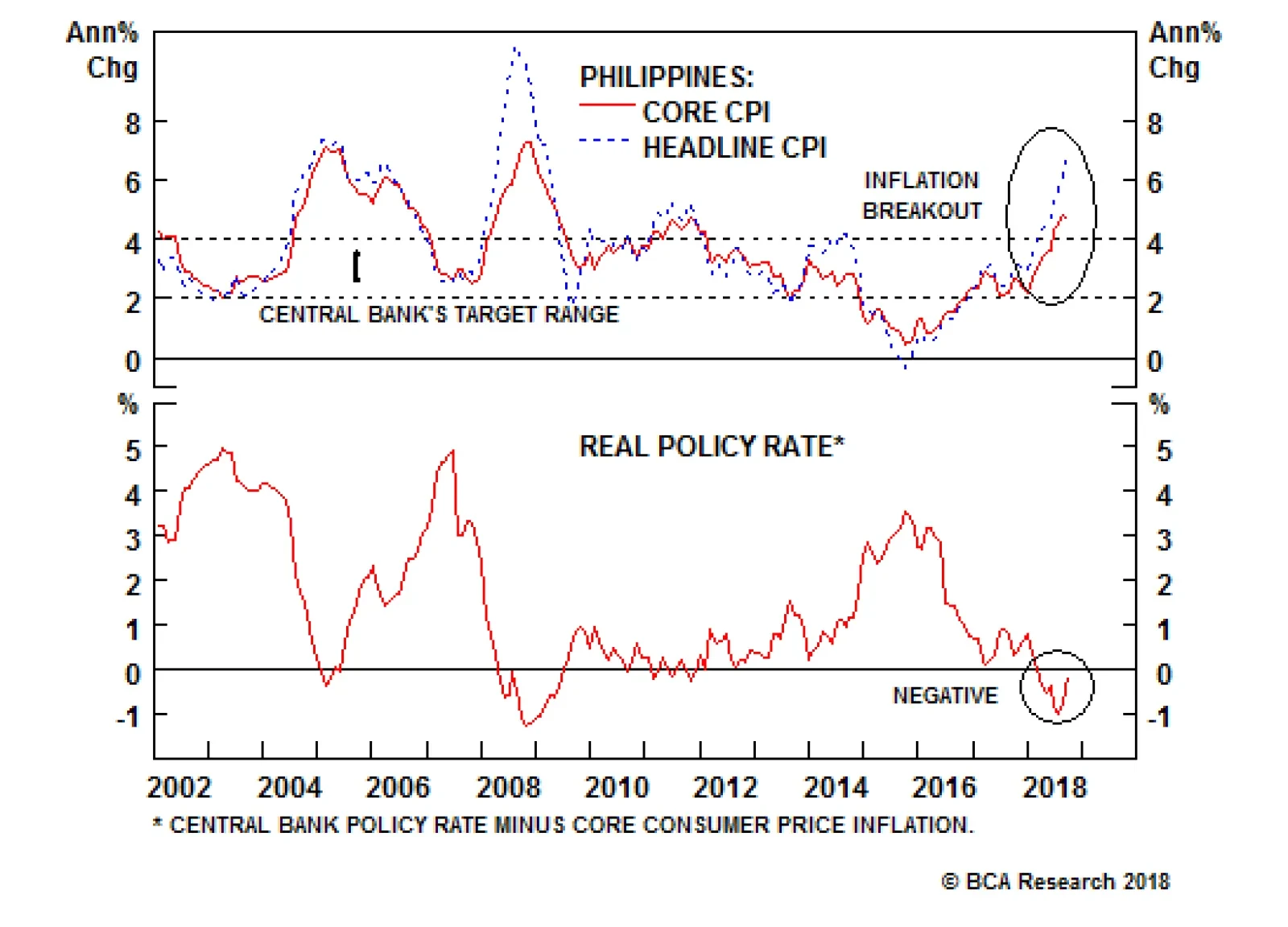 The Philippine economy continues to overheat, and the Bangko Sentral ng Pilipinas (BSP) has fallen well behind the curve. The top panel of Chart I-2 shows that both headline and core inflation measures are rising precipitously and have breached the central bank's upper target of 4% by a wide margin. Chart I-2The Central Bank Is Far Behind The Curve