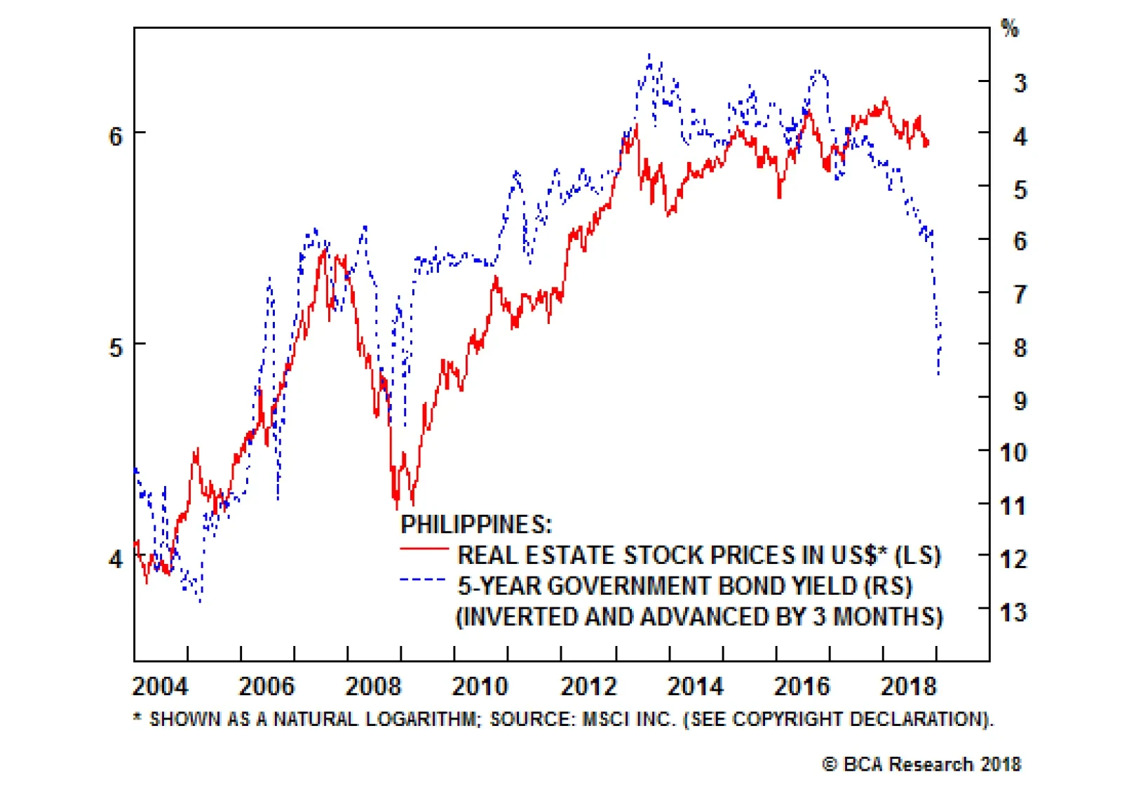 Highlights Analysis on the Chinese property market is available below. In the Philippines, domestic demand is set to accelerate at the hands of the government’s fiscal boost. The current account deficit will widen and the peso and local bonds will likely sell-off. This warrants an underweight stance in this interest rate-sensitive bourse. A new trade: Pay 2-year swap rates. The outlook for China’s property market and construction activity is downbeat. Financial market plays leveraged to mainland construction activity remain at risk. The Philippines: The Cycle Is Turning The relative performance of Philippine equities against the EM benchmark is moving inversely to the direction of relative (Philippines minus EM) local bond yields (Chart I-1). When local Philippine bond yields drop versus those of other EMs, this bourse outperforms, and vice versa. Likewise, Philippine share prices in absolute terms exhibit a negative relationship with local bond yields (Chart I-2). The rationale behind this high sensitivity in share prices to local interest rates is the large presence of banks and property stocks in the Philippines' bourse. Banks account for 20% and real estate stocks another 21% of the local stock exchange. These sectors benefit in a falling interest rate environment and suffer during periods of rising rates. Chart I-1Philippines Vs. EM: Relative Stock Prices And Bond Yields