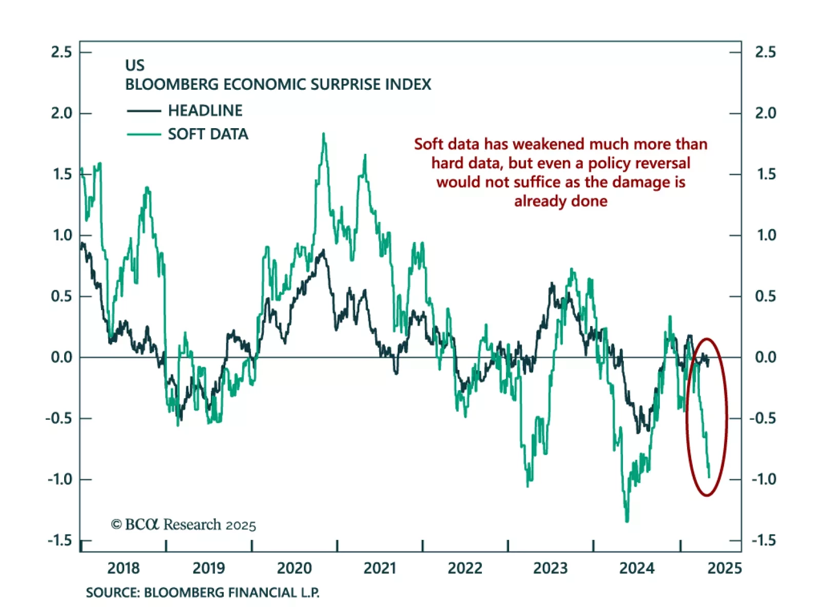 The collapse in soft data points to rising recession risks, but markets are still only priced for a mild slowdown, reinforcing our defensive positioning. As policy uncertainty and market volatility surged, consumers and businesses…