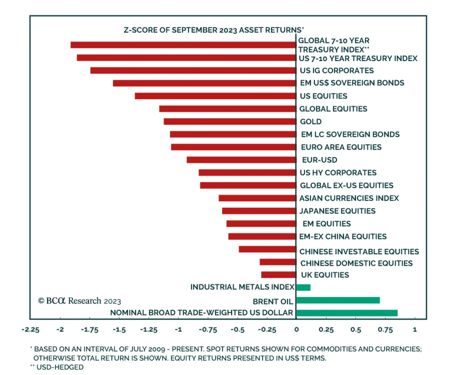 The “September Effect” was in full force again this year as the broad-based selloff continued. Nearly all major financial assets generated outsized returns last month. In particular, the “higher for longer…