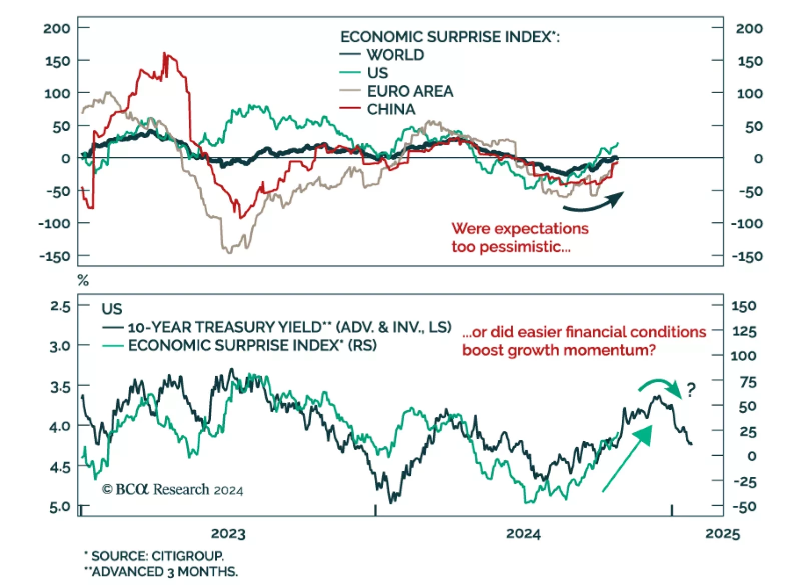 Global economic surprises have improved. Currently positive and improving in the US, they are rising from a low level in the Eurozone and China. Two explanations could explain this momentum. First, the recent easing in…