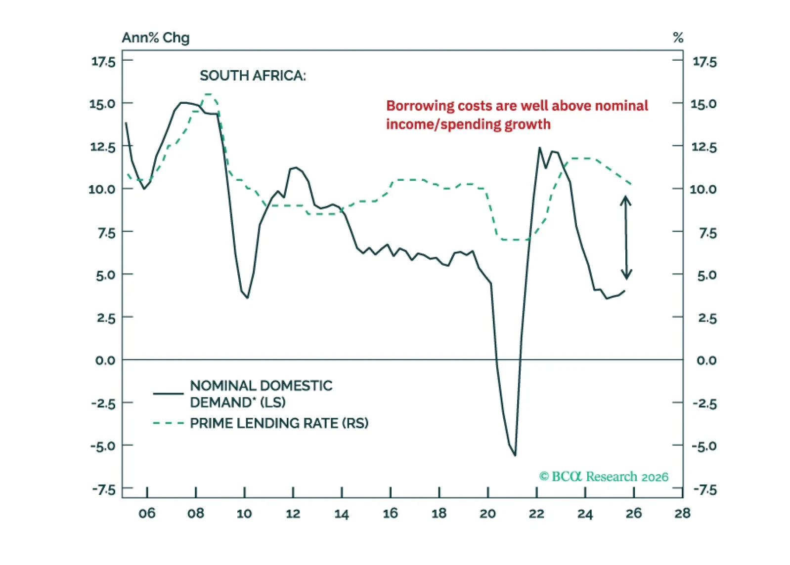South Africa’s commodity boost is fading, but its cyclical headwinds remain. As growth weakens and capital inflows dry up, the rand looks increasingly vulnerable to a reversal.