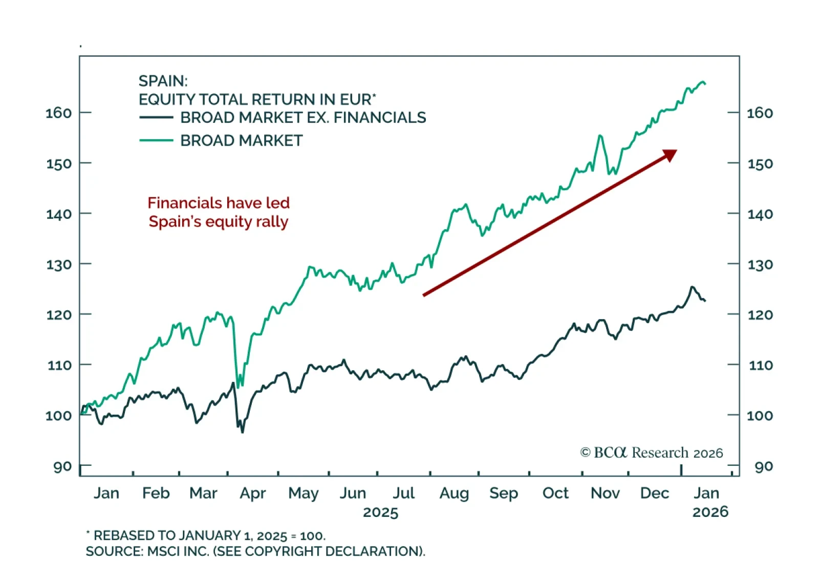 Spain's equity and bond outperformance reflects genuine fundamental repair: Lower bad loans, stronger profitability, and sustained earnings upgrades. Valuations remain undemanding despite the rally. Productivity is the key structural risk, but near-term fundamentals continue to surprise to the upside.