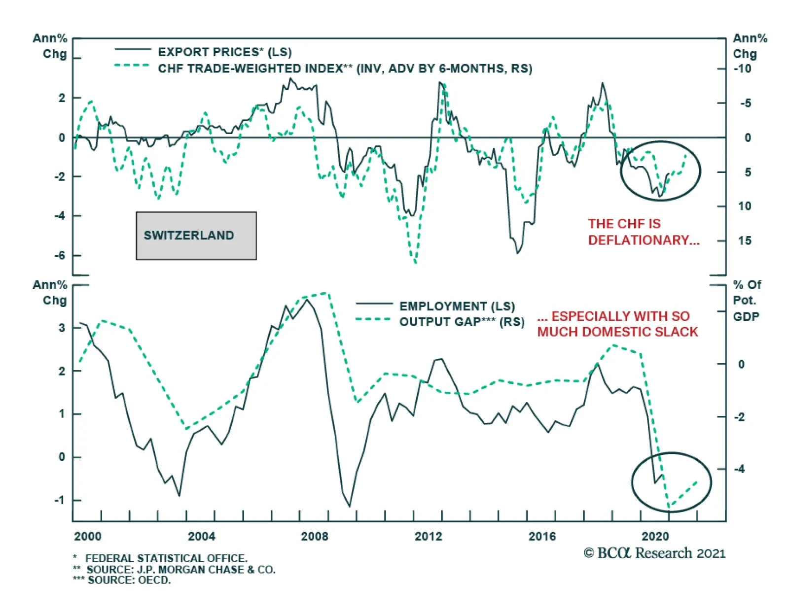 The Swiss economy has recovered smartly. As of March, the manufacturing PMI was at 66.3, the highest since 2006. If past manufacturing sentiment is prologue, the Swiss economy is about to experience its biggest rebound in decades (Chart I-1). This will quell any deflationary fears about domestic conditions in Switzerland and begin to re-anchor inflation expectations upwards. This will also be a very welcome development for the SNB. The Swiss franc has been one of the worst performing currencies this year, but that might be about to change. For one, dollar sentiment has been reset with the rise in the DXY index this year. Second, the global economy is transitioning from disinflationary to a gentle tilt towards inflation. This will lift global prices, including import prices into Switzerland. Rising import prices will ease the need for the SNB to maintain emergency monetary settings. Finally, the weakness in the currency has eased financial conditions for Swiss concerns. The Reopening Trade Most economies are entering into a third wave of the Covid-19 pandemic and the Swiss economy is no exception. However, the Swiss authorities have been able to bring the number of new infections down to levels below the euro area in general and Sweden in particular. Vaccinations are progressing smoothly with almost 20% of the population inoculated as of today. This provides a coiled springboard to lift the Swiss economy into robust growth later this year. Switzerland is one of the most open economies in the G10. Exports of goods and services account for over 65% of Swiss GDP, much higher than the euro area (Chart I-2). The constituent of Swiss exports tends to be defensive (medical goods, gold, watches, jewelry) so the franc does not necessarily outperform in a global growth upswing, but definitely does better than the dollar which anchors a more closed economy. Inflation dynamics in Switzerland will be particularly beholden to improvement in the private sector. As we show in Chart I-1, employment should remain robust in the months ahead, which will support wages. Import prices in Switzerland are also about to catapult upwards, which will help lift the consumer price basket (Chart I-3). For a small, open economy like Switzerland, the exchange rate often dictates the trend in domestic inflation, and the weakness in the franc has been a beneficial cushion for good prices. The rise in global tradeable prices is also acting as a catalyst. For the first time in many years, the pendulum might be swinging towards a worry about inflation in SNB corridors. Chart I-2Switzerland Has A Huge Exposure To Trade