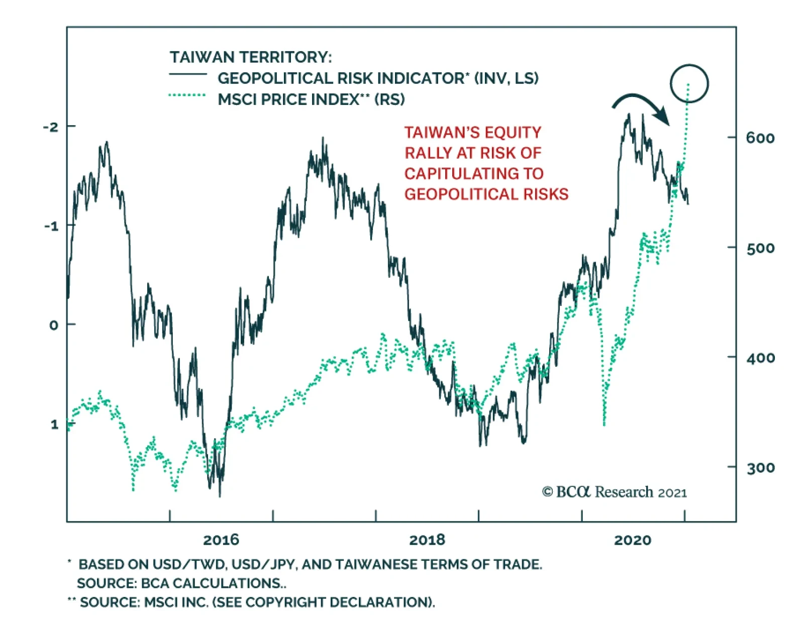 We maintain our various geopolitical longs and hedges, including gold, Japanese yen, an Indian overweight within EM, and health stocks. We remain long global defense stocks as well. Because our base case is that the current crisis will not result in war, but rather high diplomatic tensions, we are inclined to buy on the dips. But we expect a big dip even in the event of a merely diplomatic crisis that involves no jets shot down or ships sunk. Therefore for now we are closing long municipal bonds versus Treasuries, long international stocks versus American, long GBP-EUR, long Trans-Pacific Partnership countries, and long value versus growth stocks. These trades should be reinitiated once we have clarity on the magnitude of the US-China crisis, given the extremely accommodative economic and policy backdrop, which will, if anything, become more accommodative if geopolitical risks materialize yet fall short of total war. Oil and copper would suffer relative to gold in the meantime (Chart 21). Our remaining strategic portfolio still favors stocks that would ultimately benefit from instability in Greater China, such as European industrials relative to global, Indian equities relative to Chinese, and South Korean equities relative to Taiwanese. While the spike in tensions reinforces our conclusion in last week’s report that long-dated Chinese government bonds should rally on Taiwan risk, this recommendation was made in the context of discussing domestic Chinese markets and is primarily intended for mainland investors or those with a mandate to invest in Chinese assets. Foreign investors could conceivably be exposed to sanctions or capital controls in the event of a major crisis – as we have long flagged is also a risk with foreign holders of Russian ruble-denominated bonds. We have made a note in our trade table accordingly. Matt Gertken Vice President Geopolitical Strategy mattg@bcaresearch.com Footnotes 1 Brad Lendon, "Almost 40 Chinese warplanes breach Taiwan Strait median line; Taiwan President calls it a 'threat of force,'" CNN, September 21, 2020, cnn.com. 2 Richard C. Bush, "8 key things to notice from Xi Jinping’s New Year speech on Taiwan," Brookings Institute, January 7, 2019, brookings.com. 3 Trump also signed the Taiwan Travel Act on March 16, 2018 and the Taiwan Allies International Protection and Enhancement Initiative Act on March 26, 2019. For the Taiwan Assurance Act, see Kelvin Chen, "Trump Signs Taiwan Assurance Act Into Law," Taiwan News, December 28, 2020, taiwannews.com. 4 Jason Pan, "Alliance formed to draft Taiwanese constitution," Taipei Times, January 24, 2021, taipeitimes.com; Emerson Lim and Matt Yu, "Taiwan, U.S. sign agreement on scientific cooperation," Focus Taiwan, December 18, 2020, focustaiwan.tw; Ryan Hass, "A case for optimism on US-Taiwan relations," Brookings Institute, November 30, 2020, brookings.com. 5 Thomas J. Shattuck, "Stuck in the Middle: Taiwan’s Semiconductor Industry, the U.S.-China Tech Fight, and Cross-Strait Stability," Foreign Policy Research Institute, Orbis (65:1) 2021, pp. 101-17, www.fpri.org. Section II: GeoRisk Indicators China