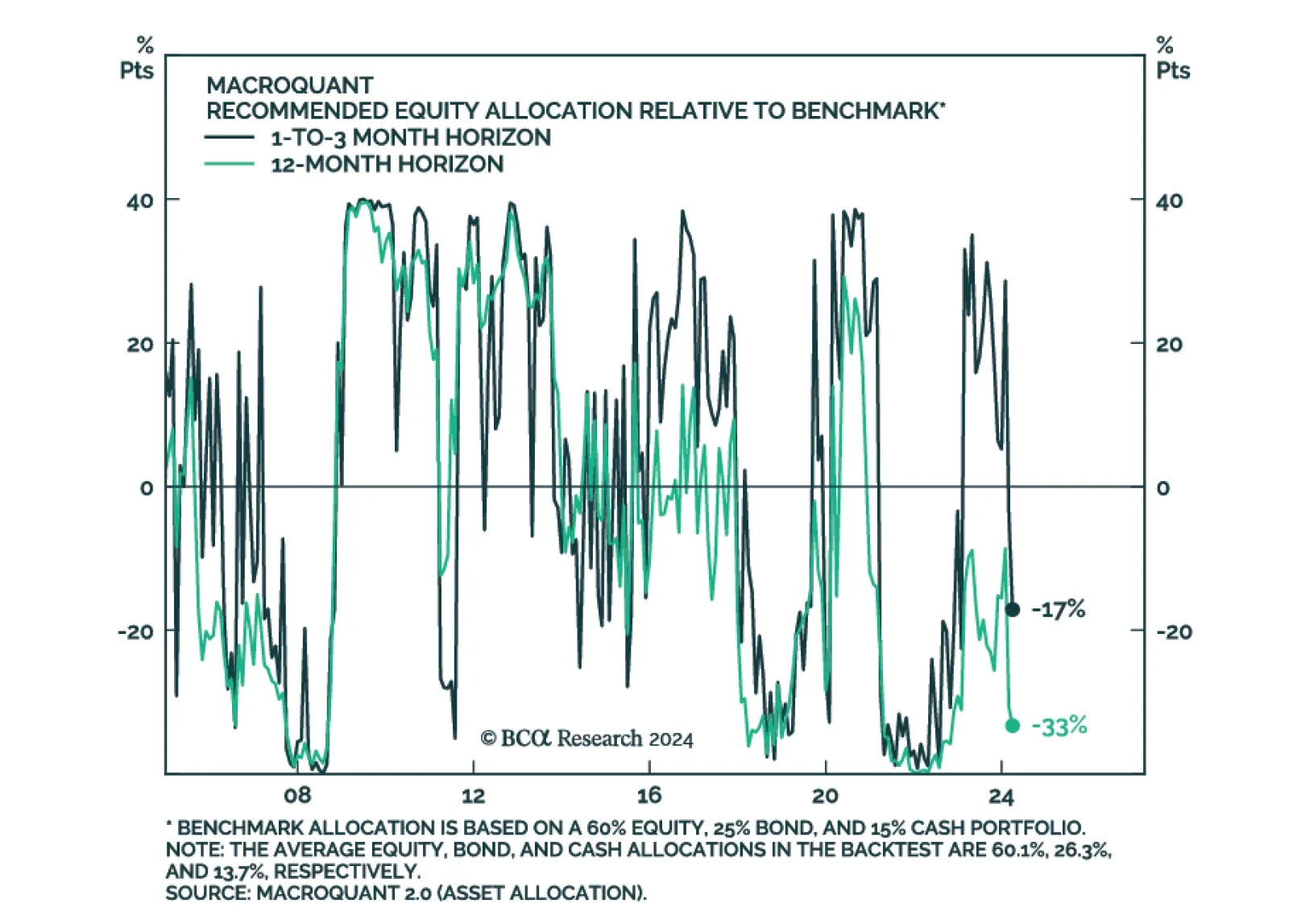 MacroQuant downgraded equities from neutral to underweight on a 1-to-3 month horizon. The model suggests increasing exposure to cash.