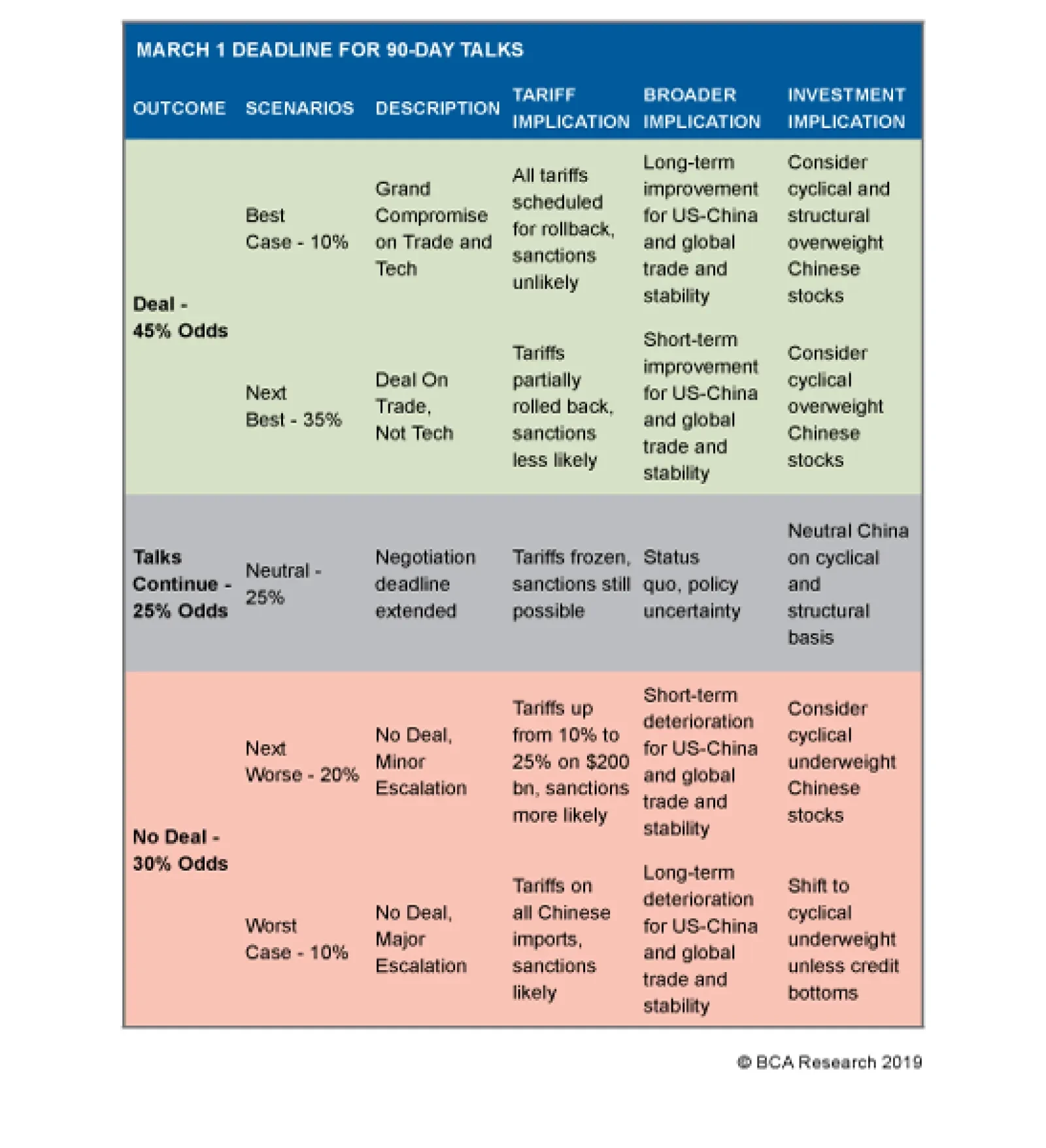 The above table presents our geopolitical strategists latest expectations of where the U.S. and China will be on March 1. We assign only 10% each to the “black and white” outcomes: a “Grand Compromise” or…