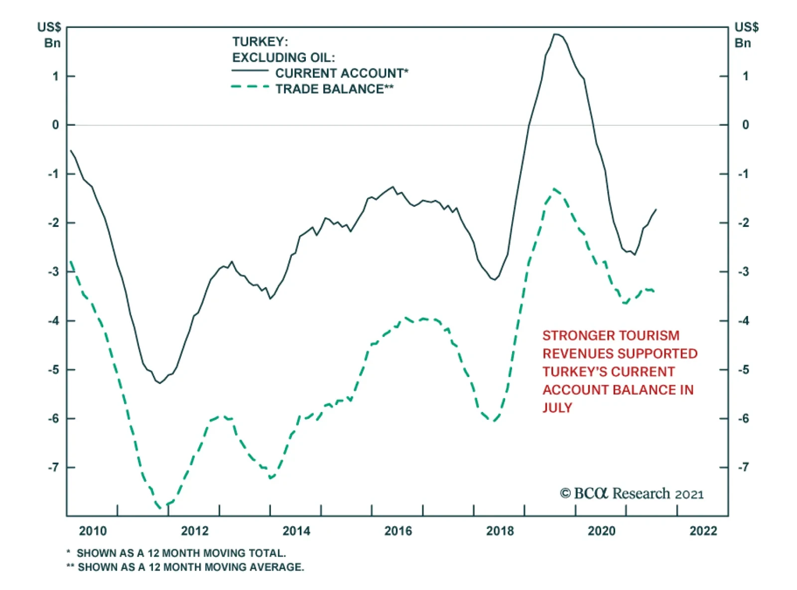 Turkey’s current account deficit narrowed to $0.68 billion in July from June’s $1.13 billion. The improvement comes on the back of a recovering tourism sector. The trade balance in travel services strengthened to a pandemic high…