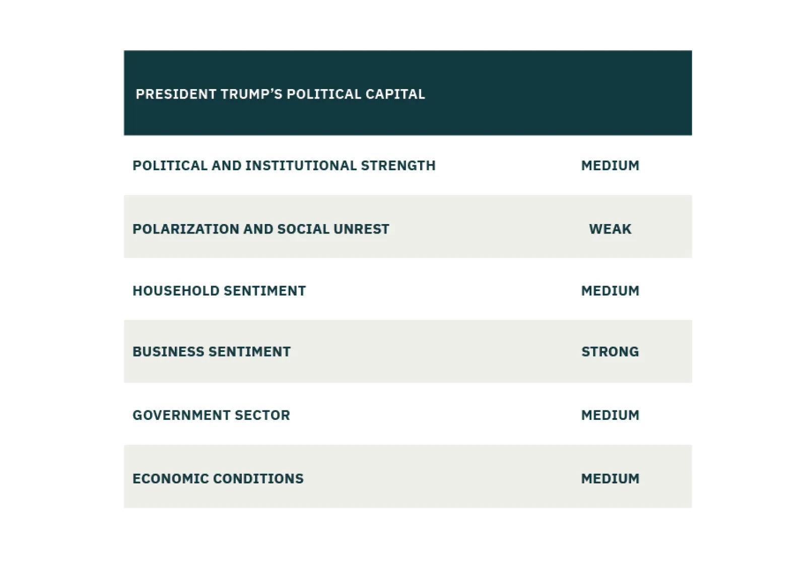 President Donald Trump’s political capital is moderate, as he frontloaded his most disruptive policies within the first year.