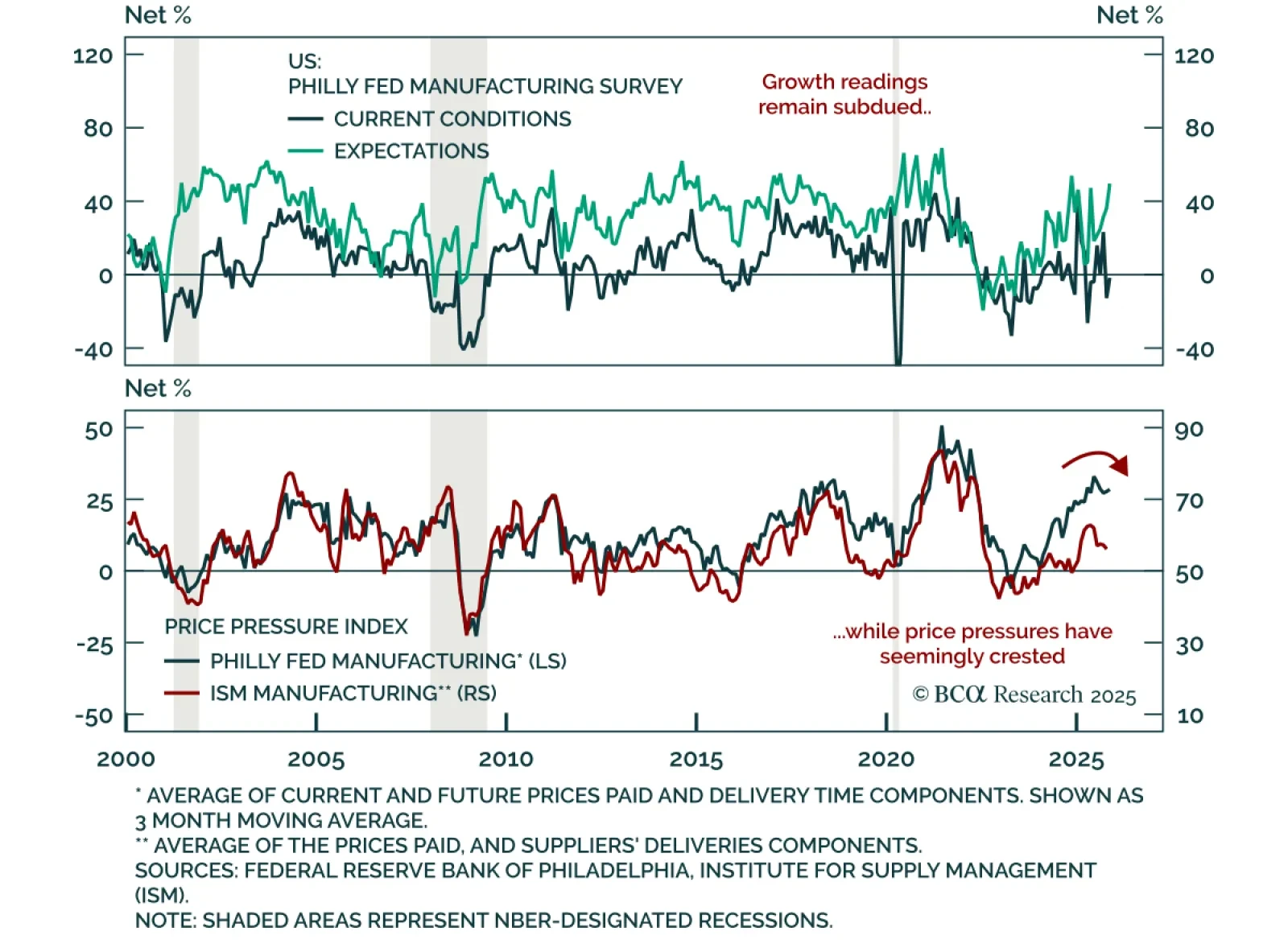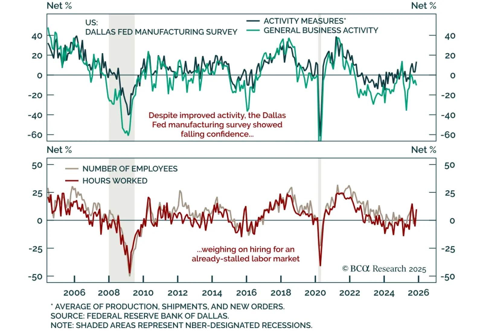 The November Dallas Fed manufacturing survey painted a mixed picture, with softer business sentiment but improving production and stable employment. The headline index fell to -10.4 from -5.0, while the production component jumped 15 points to 20.5, showing…