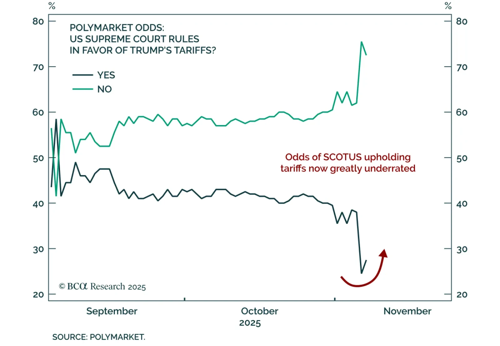 Markets are overpricing the risk of the Supreme Court striking down Trump’s tariffs. Our Chart Of The Week comes from Matt Gertken, Chief US and Geopolitical Strategist. Following Wednesday’s Supreme Court hearing, betting markets have moved to reflect…