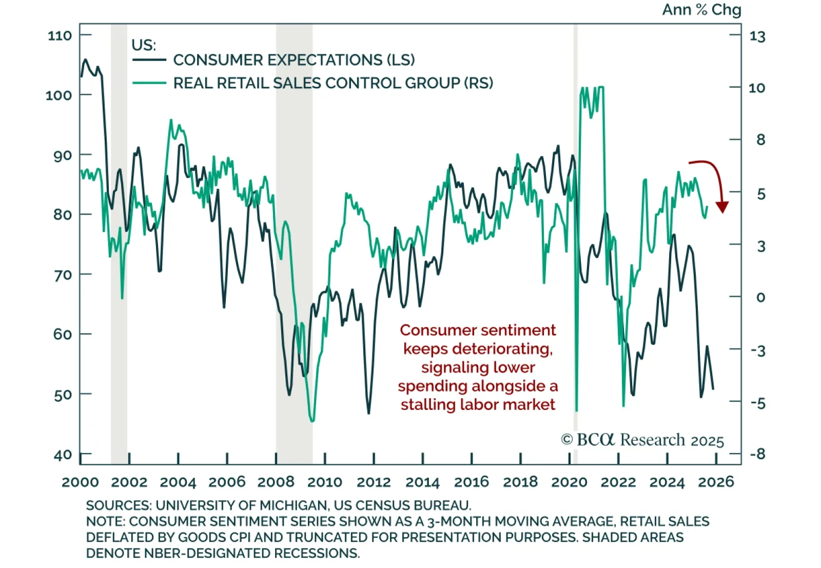 US consumer sentiment fell sharply in November, signaling weaker momentum despite resilient consumption data. The preliminary University of Michigan Index dropped more than expected to 50.3 from 53.6, near all-time lows. Both current conditions and…