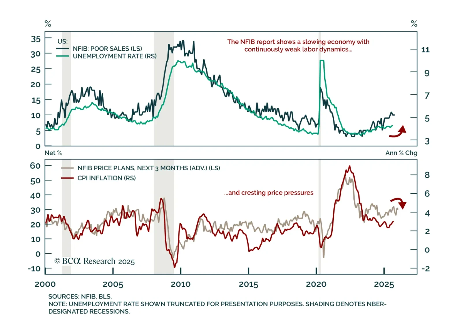 The October NFIB Small Business Optimism Index missed estimates, ticking down to 98.2 from 98.8, reflecting softer expectations and earnings. Lower earnings were driven by both weaker sales volumes and higher costs. The share of small businesses citing poor…