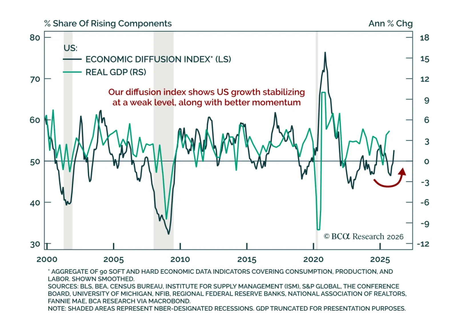 After weakening through 2025, US growth indicators now point to stabilization at a weak level. Our US growth diffusion index, which combines 90 hard and soft indicators and has historically led GDP turning points, shows growth stabilizing. Importantly, this…