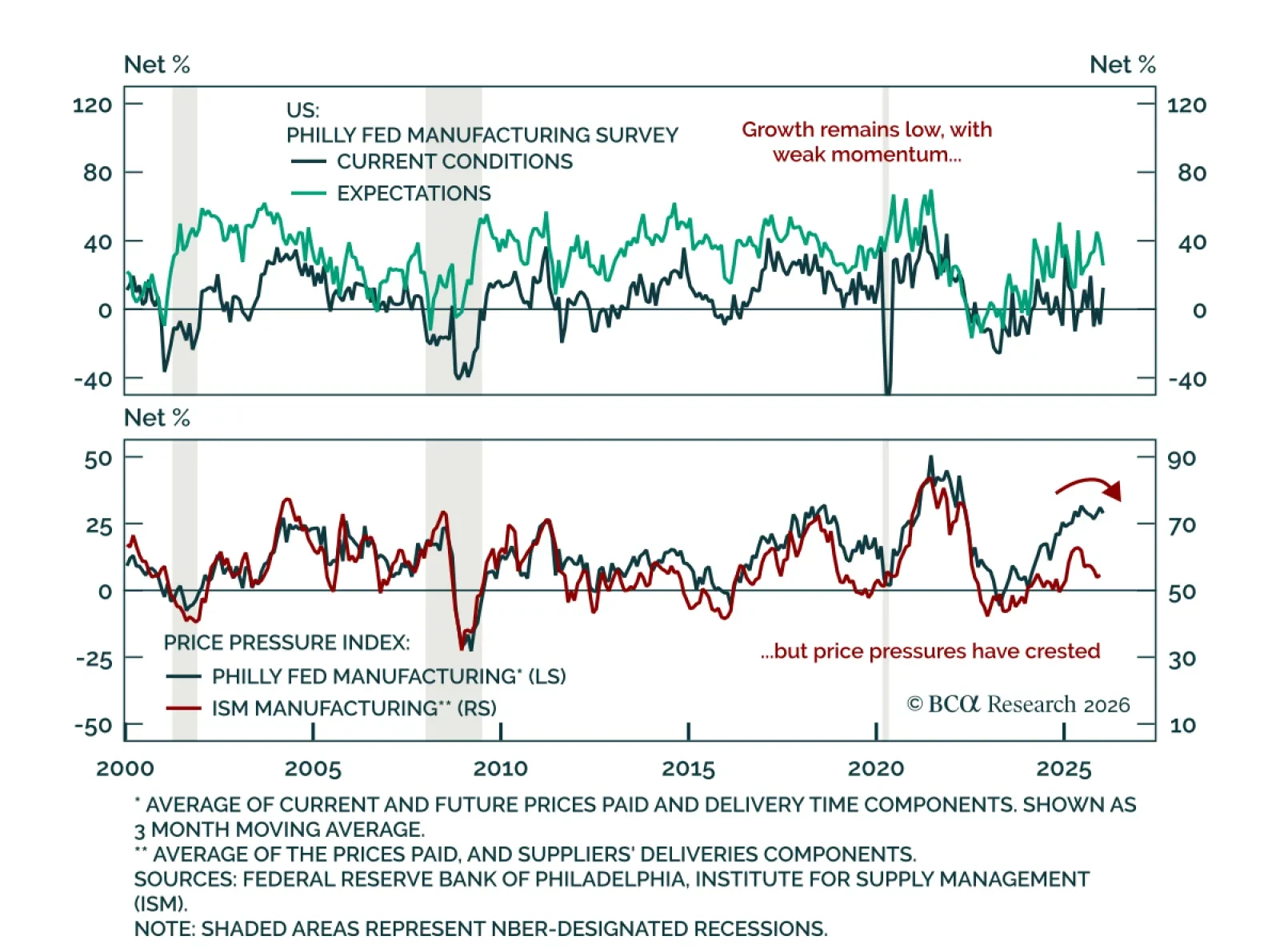 Maintain a modestly defensive allocation as manufacturing surveys signal resilience without momentum. The January Philly Fed and Empire Manufacturing surveys both beat estimates, rebounding to 12.6 from -10.2 and to 7.7 from -3.9, respectively. New orders and…